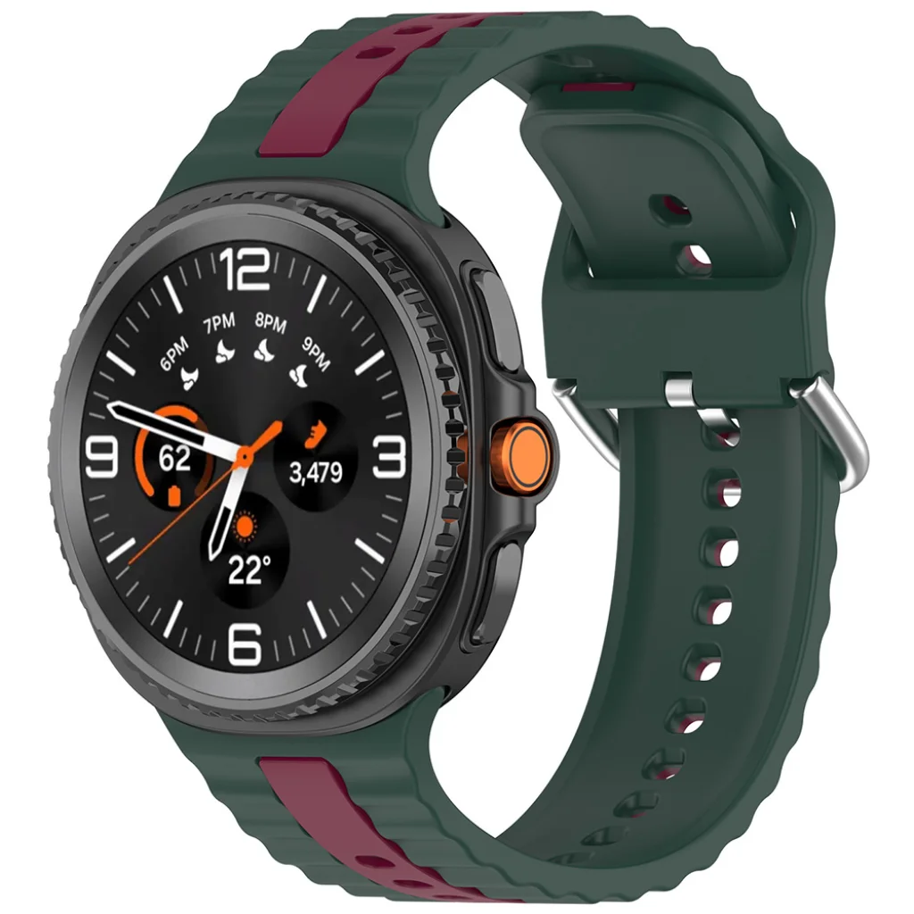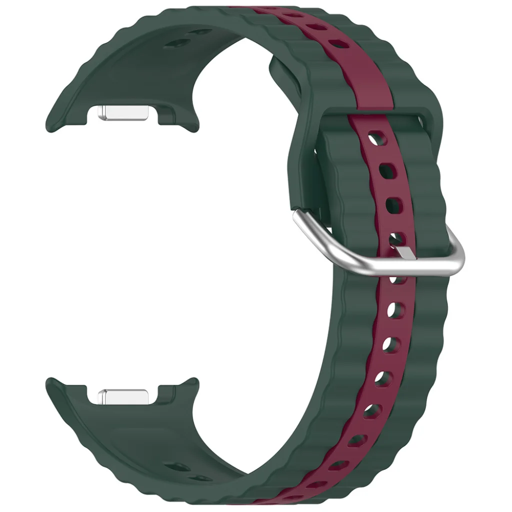 Az óraszíj az "Éjféli Smaragd" (mélyzöld) alapszínnel hódít, melyet elegánsan egészít ki egy kontrasztos, borvörös vagy burgundi sáv a közepén. Ez a két tónusú kialakítás modern és figyelemfelkeltő megjelenést biztosít. A szíj külső szélein végigfutó egyedi, hullámos textúra nemcsak esztétikus, hanem hozzájárul a kényelmes viselethez is, egyedi tapintást kölcsönözve neki.