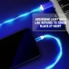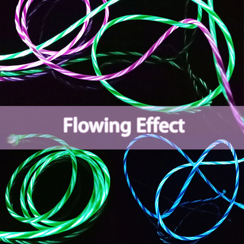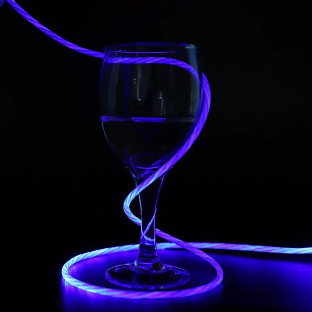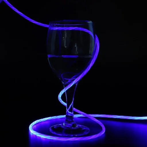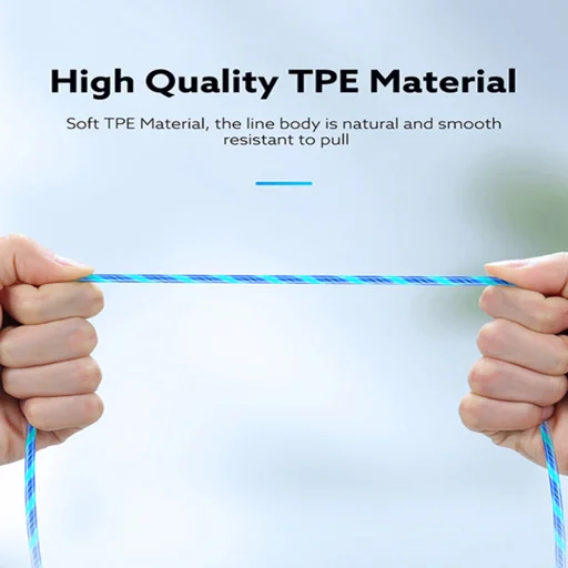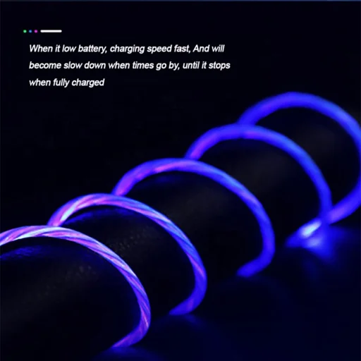 - Lenyűgöző áramló LED-fényeffektus: A kábelen végigfutó élénk, pulzáló, többszínű fényáram (rózsaszín, kék, zöld) nemcsak fantasztikusan néz ki sötétben vagy gyenge fényviszonyok között, hanem egyúttal vizuális visszajelzést is ad a töltés állapotáról. A fényfolyam sebessége jelzi az akkumulátor töltöttségi szintjét: alacsony töltöttségnél gyorsabban, majd ahogy a töltés halad, a fényfolyam lassul, végül teljesen feltöltve leáll. Így könnyedén nyomon követheti, hogy eszköze mikor van készen a használatra. Éjszaka különösen hasznos, hogy a kábel könnyen megtalálható és megvilágítja a csatlakozási pontot.