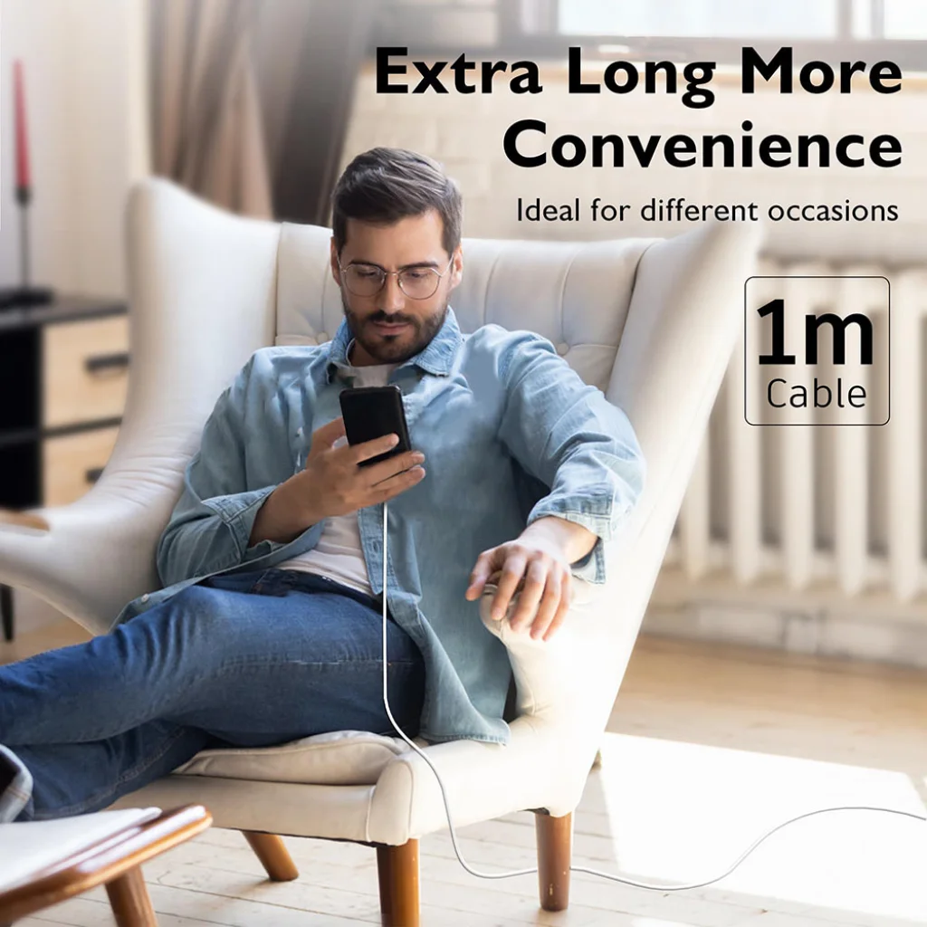 Az 1 méteres hosszúság kényelmes használatot biztosít különböző helyzetekben. Akár az ágyból, a kanapéról, vagy egy asztalnál szeretné tölteni eszközét, a kábel hossza elegendő szabadságot nyújt, elkerülve a feszültséget és a kényelmetlenséget.
