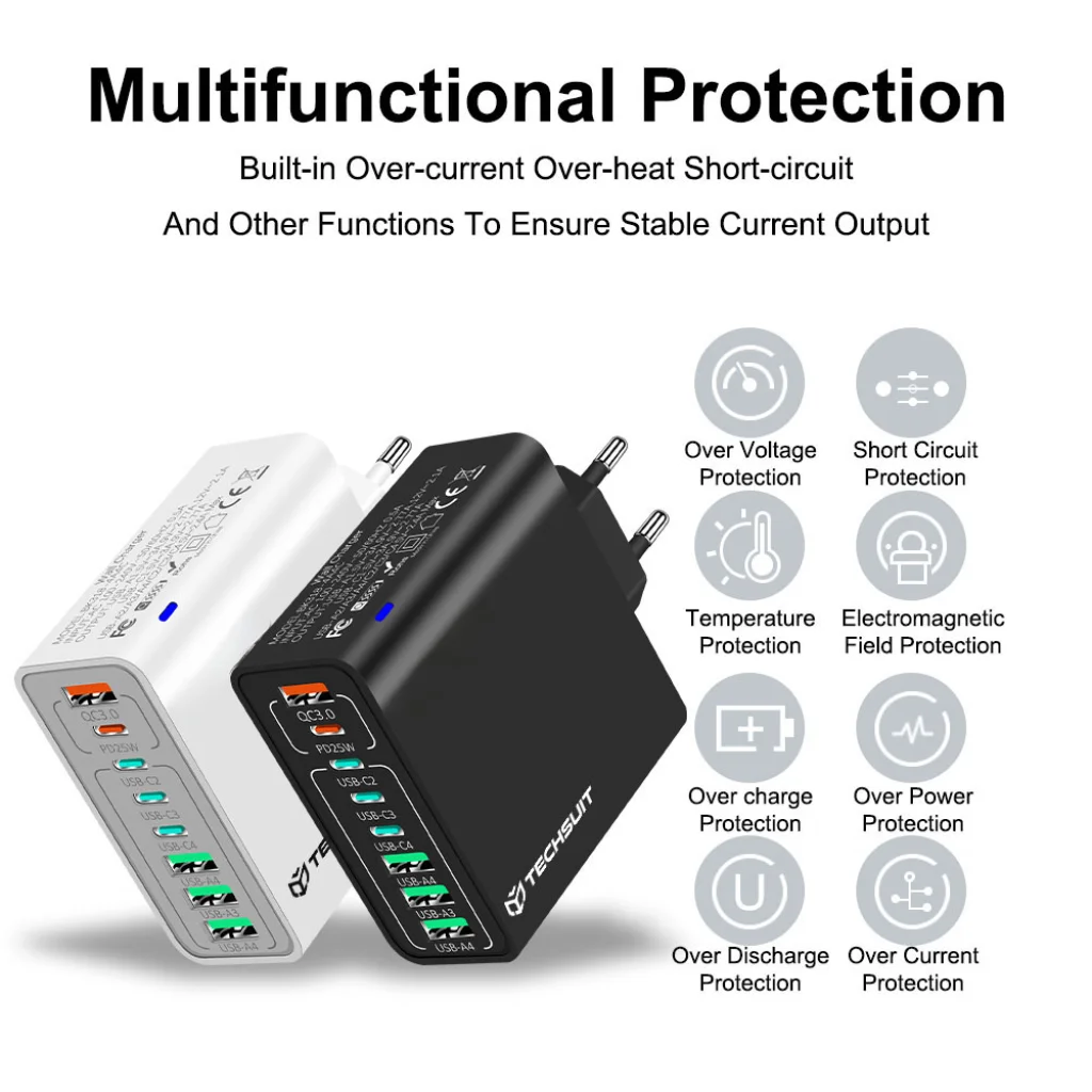A Techsuit CHPD224 töltő nem csupán gyors, de rendkívül biztonságos is. A beépített intelligens chip és a multifunkcionális védelmi rendszerek garantálják, hogy eszközei és maga a töltő is védve legyen a túltöltés, túláram, túlmelegedés, rövidzárlat és egyéb veszélyek ellen. Élvezze a stabil és alacsony hőmérsékletű töltést, amely kíméli az akkumulátorokat és meghosszabbítja az eszközök élettartamát.