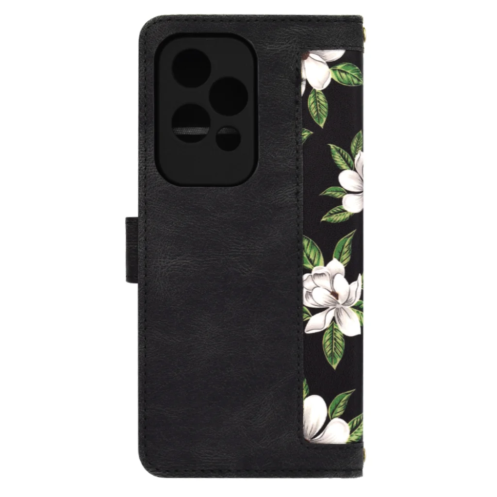 A Techsuit FlipCraft tok Honor 200 Lite készülékedre nem csupán egy védelmi eszköz, hanem egy stílusos kiegészítő is, amely a természet szépségét hozza el a mindennapokba. Az "A hajnal virágai" elnevezésű minta fekete alapon pompázó, részletgazdag fehér magnóliavirágokkal és élénkzöld levelekkel kápráztat el, elegáns és friss megjelenést kölcsönözve telefonodnak.