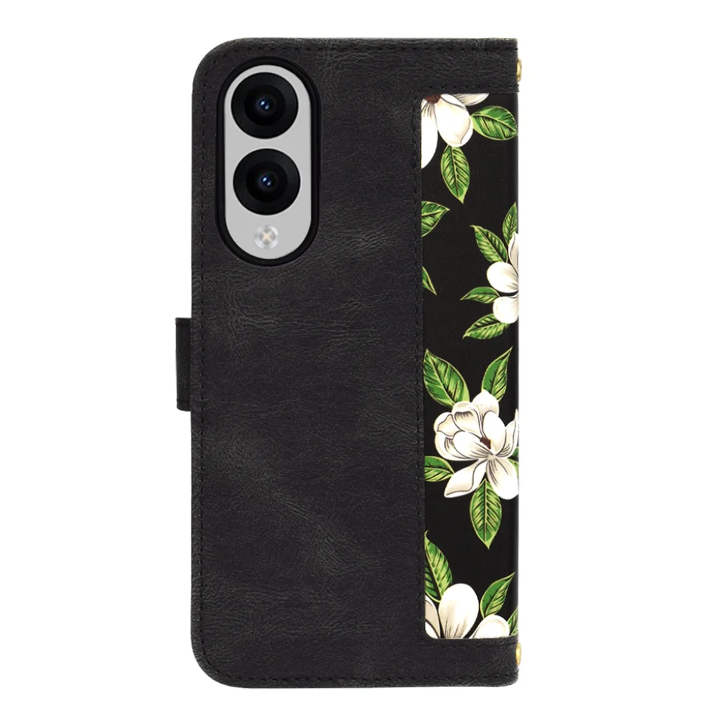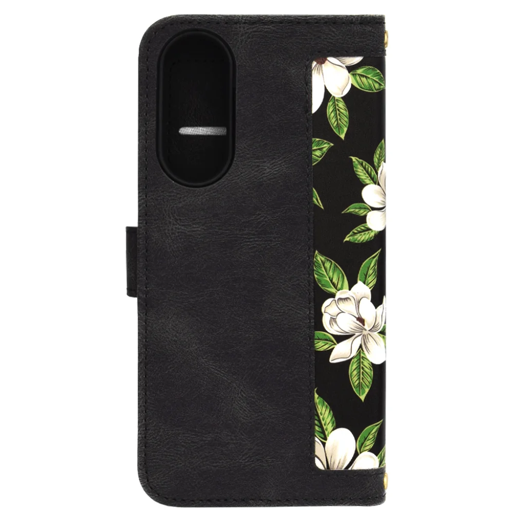A tok elegáns fekete alapszínét egy mesés, részletgazdag virágmintázat díszíti: fehér magnólia-szerű virágok vibráló zöld levelekkel. Ez a "Hajnal Virágai" elnevezésű minta minden tekintetet magára vonz, és kifinomult eleganciát sugároz. A külső borítás kiváló minőségű, strapabíró műbőrből (PU bőr) készült, amely kellemes tapintású és ellenáll a mindennapi kopásnak és karcolásoknak. Belül egy rugalmas, puha TPU/szilikon keret biztosítja a telefon stabil rögzítését, elnyelve az esetleges ütéseket.