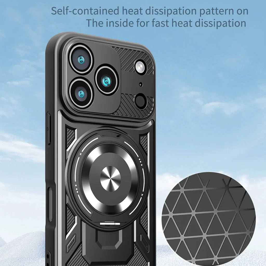 - Belső hőelvezetés: A tok belső felületén egy speciális, önhordó hőelvezető minta található (háromszög alakú rácsozat), amely segít elvezetni a hőt, megakadályozva a telefon túlmelegedését intenzív használat során.