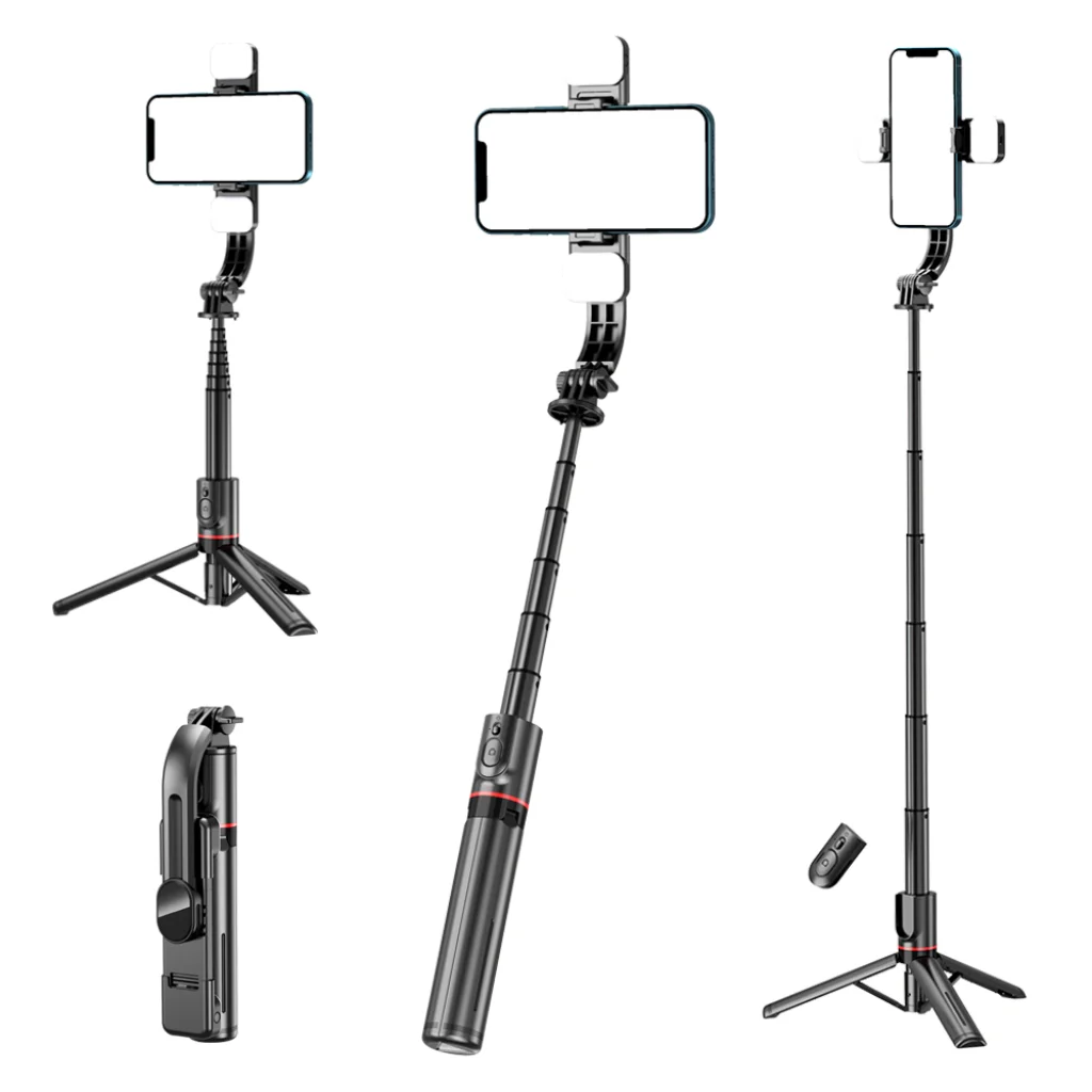 Termék leírás Techsuit - Selfie Bot (L12D) - Stabil Állvány Bluetooth Távirányítóval, 2x Levehető LED Fény, 108cm - Fekete