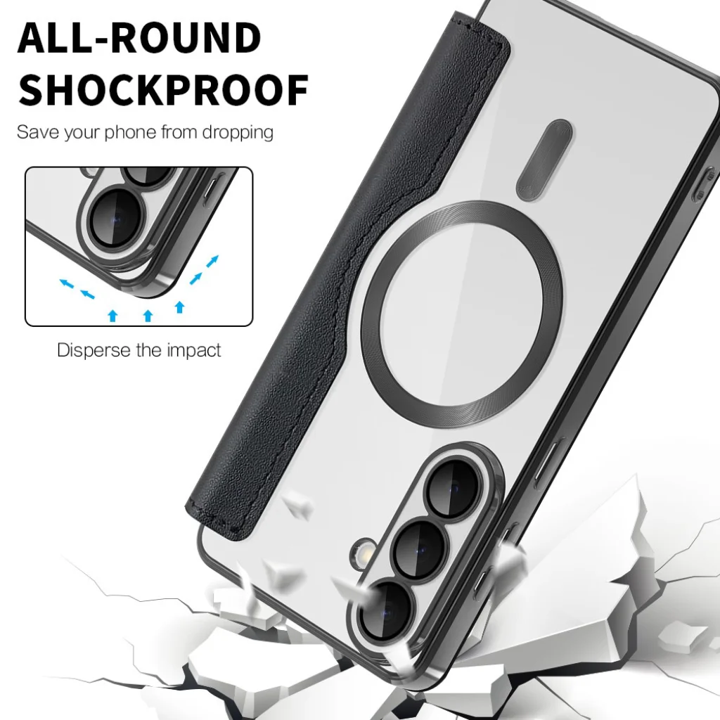 A minőség találkozik a tartóssággal. A tok többrétegű szerkezettel rendelkezik, amely ötvözi a kiváló minőségű ökobőrt, a rugalmas TPU-t (termoplasztikus poliuretán), a szilikont és az erős polikarbonátot egy kompakt, könnyű és rendkívül tartós formában. Ez az anyagösszetétel optimális egyensúlyt teremt a rugalmasság és a merevség között. A külső ökobőr elegáns és kellemes tapintású, a belső imitált mikroszálas bélés pedig óvja a telefon kijelzőjét a karcolásoktól. Az átlátszó hátlap lehetővé teszi, hogy Samsung Galaxy S26 készüléke eredeti szépsége továbbra is látható maradjon, miközben a fekete, bőrhatású oldallap és előlap prémium megjelenést kölcsönöz.
