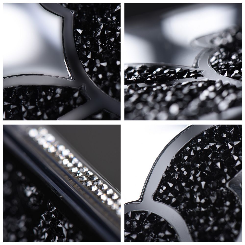 - Elegáns tükörhatású hátlap: A fekete kristályos mackó minta egy sima, fényes, tükröződő felületen helyezkedik el, ami modern és luxus megjelenést biztosít, miközben visszaveri a fényt, még inkább kiemelve a design különlegességét.