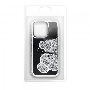 A tok legfőbb vonzereje a fekete alapon elhelyezkedő, csillogó ezüst mackó minta, melyet apró, fénylő kristályok borítanak. A mackó figurát elegáns, ezüst színű keret emeli ki, amely a kamera sziget körül is visszaköszön, egységes és prémium megjelenést biztosítva. Az átlátszó oldalsó élekbe szintén beépített apró, csillogó kövek tovább fokozzák a tok fényét és egyediségét, elegáns csillogást kölcsönözve minden mozdulatnál. A mackó karakterét a fekete, stilizált szemüveg teszi még különlegesebbé és játékosabbá.