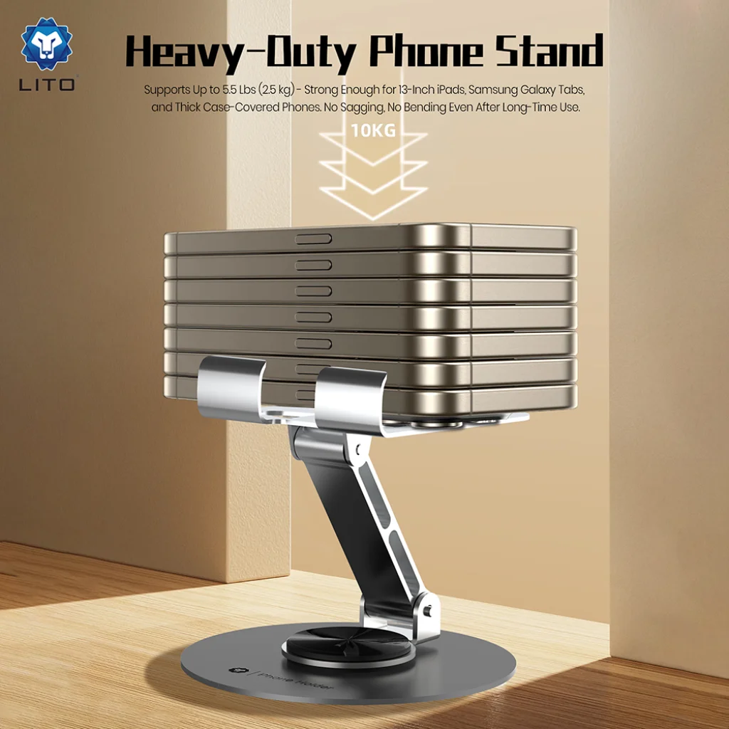 - Robusztus és tartós szerkezet: A nehéz terhelésre tervezett Lito telefontartó akár 2,5 kg (5,5 font) súlyt is képes megtartani, így gond nélkül elbírja még a 13 hüvelykes iPadeket és Samsung Galaxy táblagépeket is. Nincs többé megereszkedés vagy elhajlás még hosszú távú használat után sem, köszönhetően a prémium, alumínium ötvözet anyagnak.