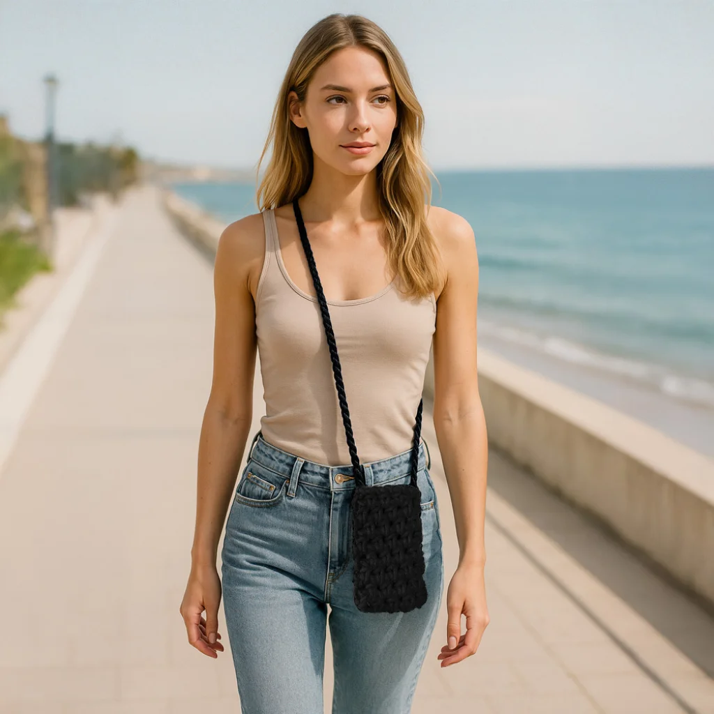Add meg a nyári megjelenésed varázsát ezzel a fekete telefonhoz készült kézitáskával, amelyet a kézi és lassú divatirányzatok inspiráltak.
