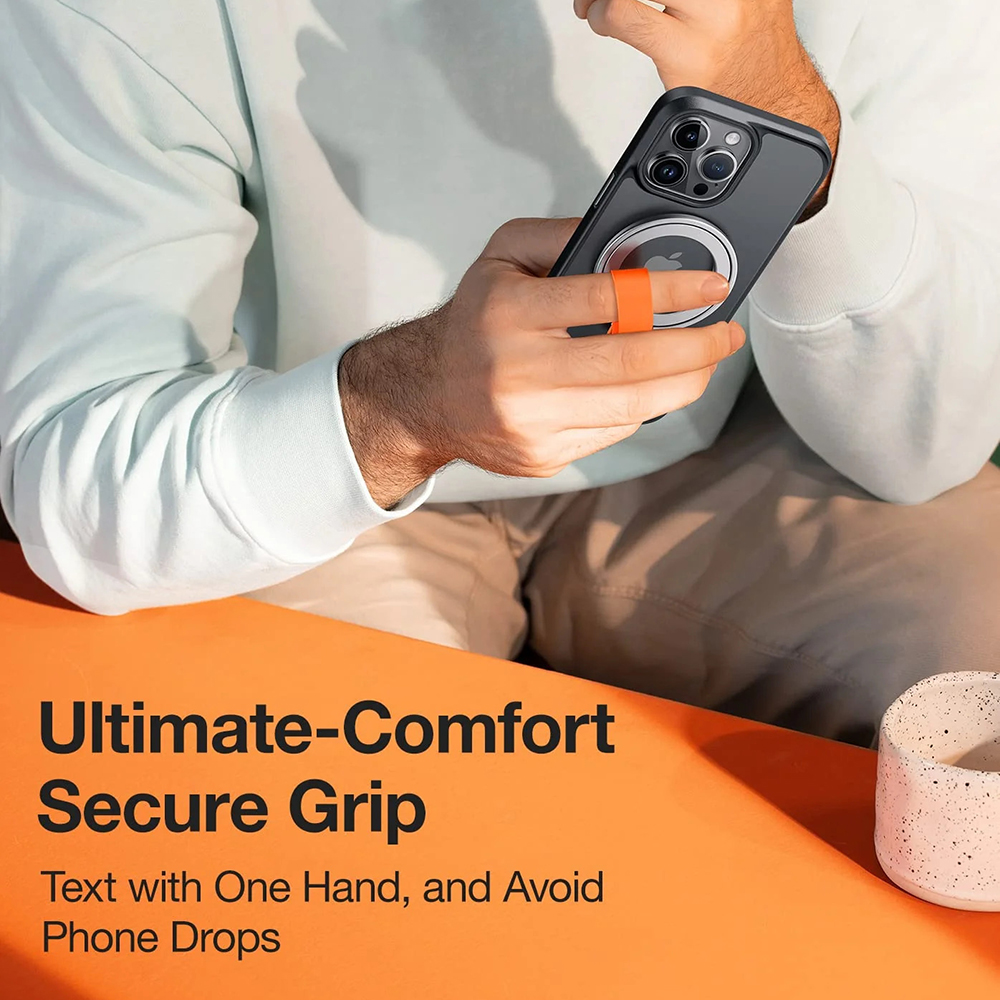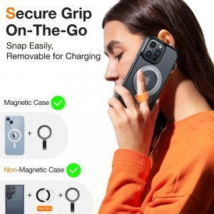 A gyűrű levehető kialakítása kulcsfontosságú. Akkor vegye le, amikor szüksége van rá, és távolítsa el, amikor vezeték nélküli töltést szeretne használni anélkül, hogy a tokot is el kellene távolítania ("Removable for Charging"). A szilikonnal bevont felület gondoskodik róla, hogy telefonja minden alkalommal karcmentes maradjon, amikor a gyűrűt felhelyezi vagy leveszi ("Keep Your Phone Scratch-Free").
