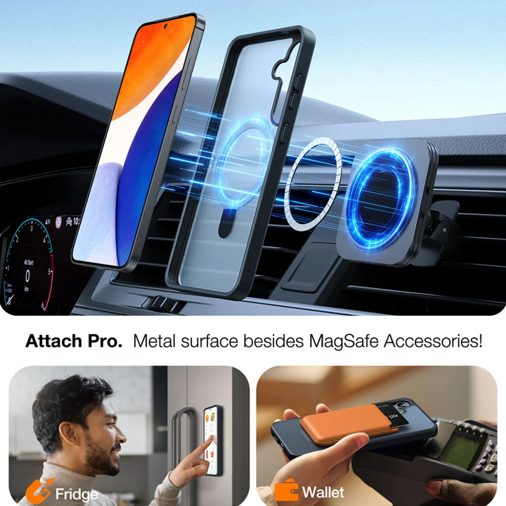 A tok emellett az "Attach Pro" funkcióval is rendelkezik, amely egy fém felületet biztosít a MagSafe kiegészítők és más mágneses felületek számára. Könnyedén rögzítheted telefonodat autóba, hűtőre, vagy használhatsz hozzá mágneses pénztárcát/kártyatartót, így maximális rugalmasságot élvezhetsz a mindennapokban.