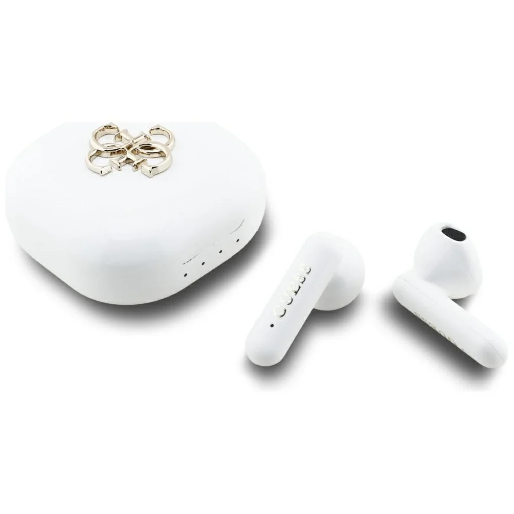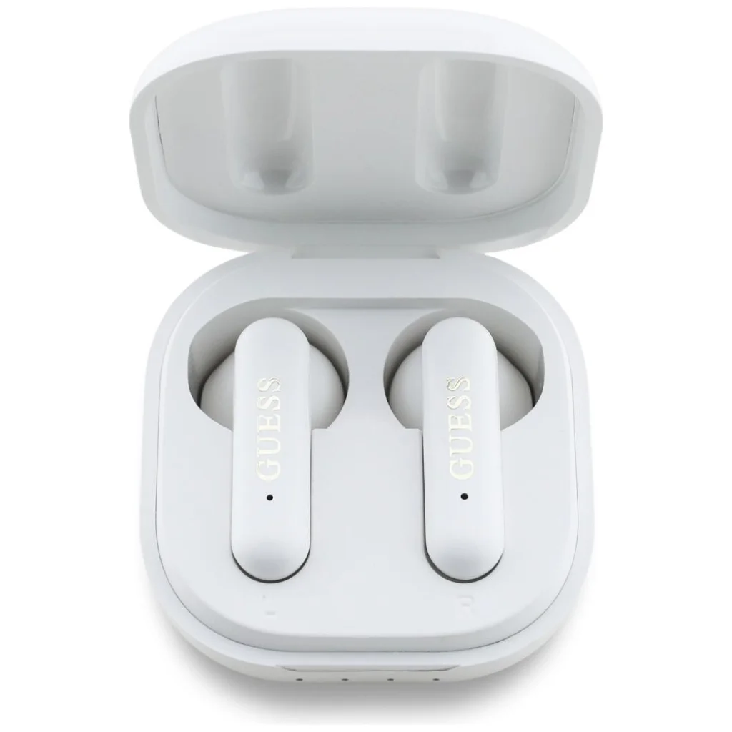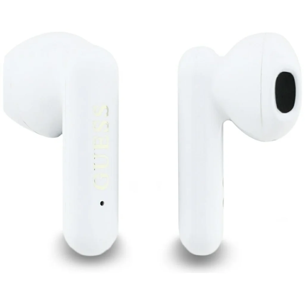 A fülhallgatók letisztult, ergonomikus kialakításúak, amelyek kényelmesen illeszkednek a fülbe. Mindkét fülhallgató szárát elegáns, vertikálisan elhelyezett, arany/ezüst színű "GUESS" felirat díszíti, amely harmonizál a tok fém logójával, tovább erősítve a márkaképviseletet.