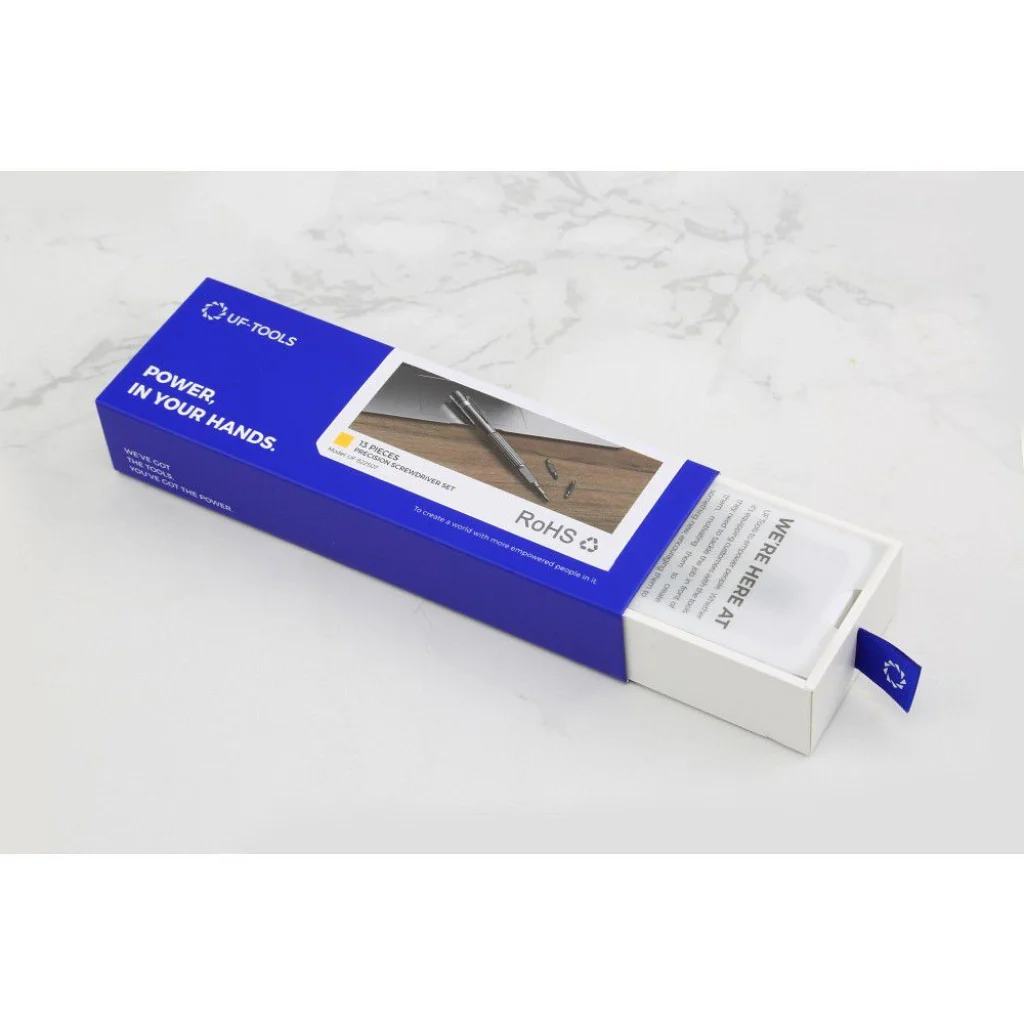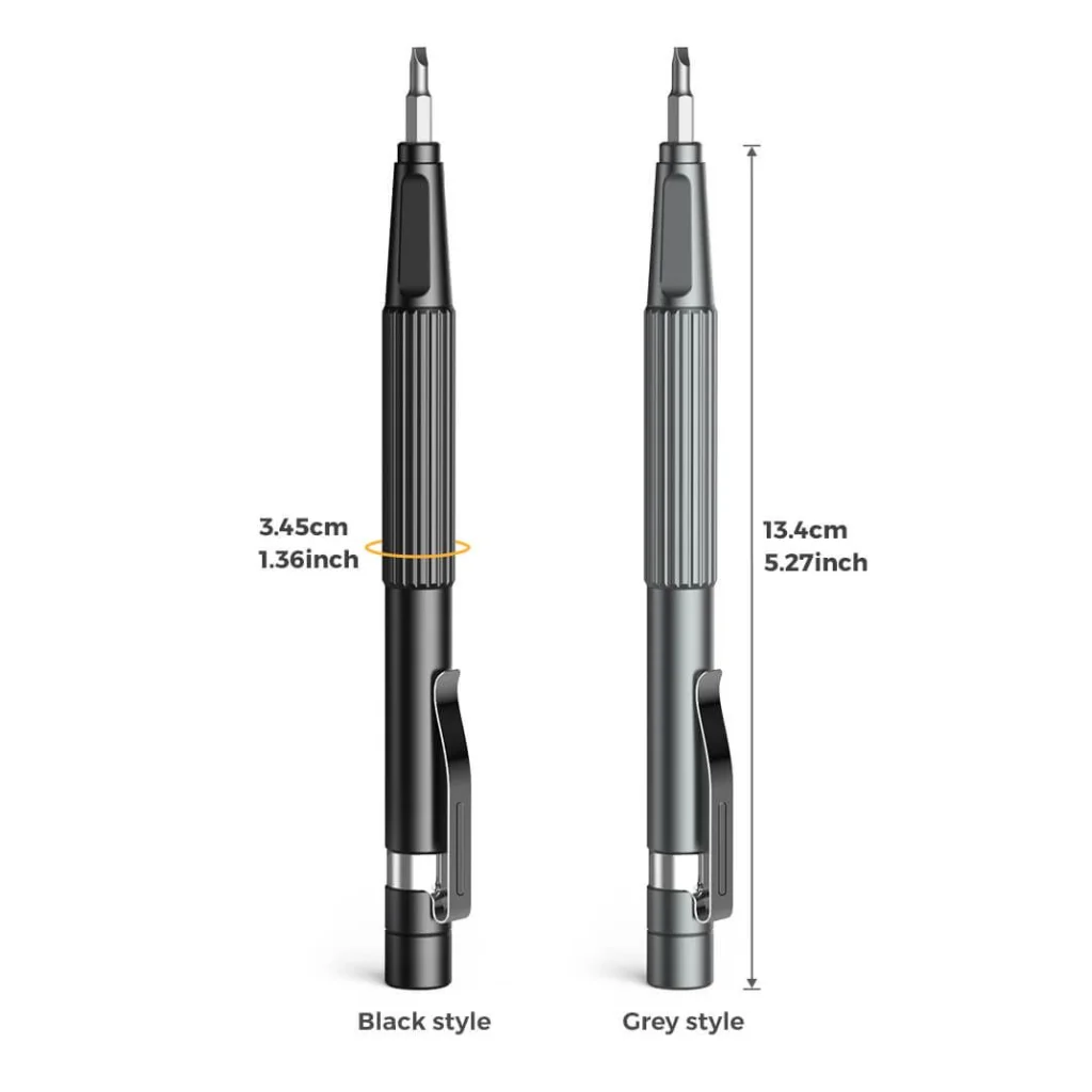 Professzionális 13 az 1-ben hordozható csavarhúzó toll formában. Ideális szemüvegek, órák, hordozható ventilátorok, számítógépek és más elektronikus eszközök javítására. Mindig kéznél lehet - ultra könnyű és kompakt. Kompakt és könnyű Szinte bárhová magaddal viheted - a beépített klipsz lehetővé teszi, hogy a csavarhúzót a zsebedhez vagy jegyzetfüzetedhez csíptesd. Tökéletes eszköz a kis, mindennapi javításokhoz. Különféle hegyek A készlet több hegyet tartalmaz, mint más hasonló termékek, ami növeli a sokoldalúságát. A hegyek tárolása a tokon belül megkönnyíti a rendszerezést és a hozzáférést. Kényelmes Ergonomikus kialakítás és csúszásmentes felület biztosítja a kényelmes használatot és energiamegtakarítást munka közben. Masszív kialakítás Tartós alumínium ötvözetből készült, amely ellenáll a deformációnak és hosszú élettartamot biztosít. Specifikáció: Méretek: Magasság: 13,4 cm Kerület: 3,45 cm