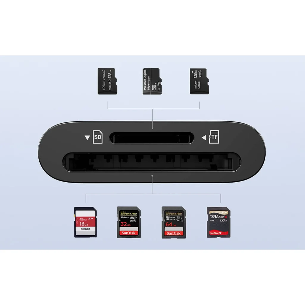 A Ugreen CM265 lehetővé teszi, hogy egyszerre két különböző memóriakártyáról (SD/Micro SD) olvasson és írjon adatokat, így nincs szükség a folyamatos kártyaváltásra. A kártyák széles skáláját támogatja, például SD, SDHC, SDXC, Micro SD, Micro SDHC, Micro SDXC és RS-MMC kártyákat, így rendkívül sokoldalú és praktikus.