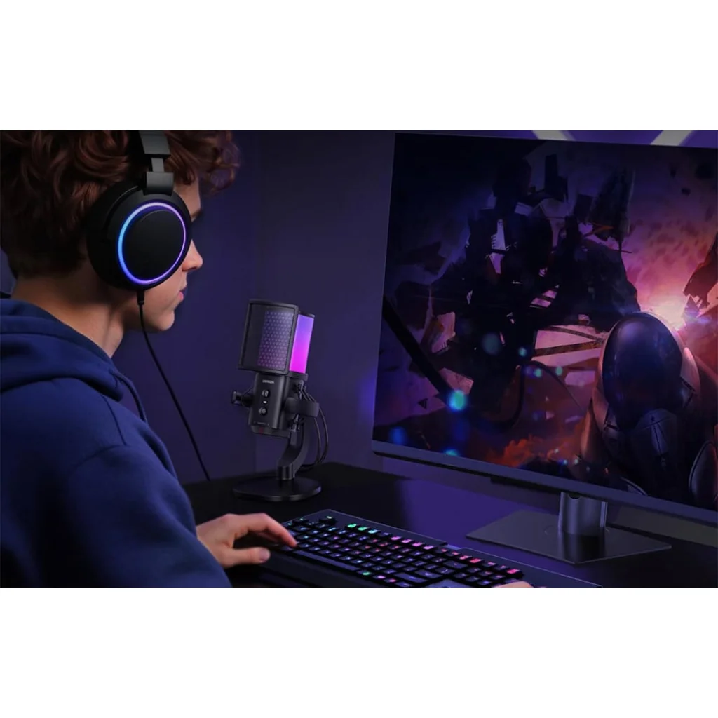 Egyszerű vezérlést és gyors csatlakozást biztosít, nincs szükség illesztőprogramok telepítésére. Egyérintéses némítógombjával azonnal kikapcsolhatja a mikrofont, a forgatógombbal pedig precízen szabályozhatja a hangerőt. Beépített RGB háttérvilágítása 7 különböző üzemmódot kínál, így a mikrofon megjelenését a stream vagy az asztal hangulatához igazíthatja.