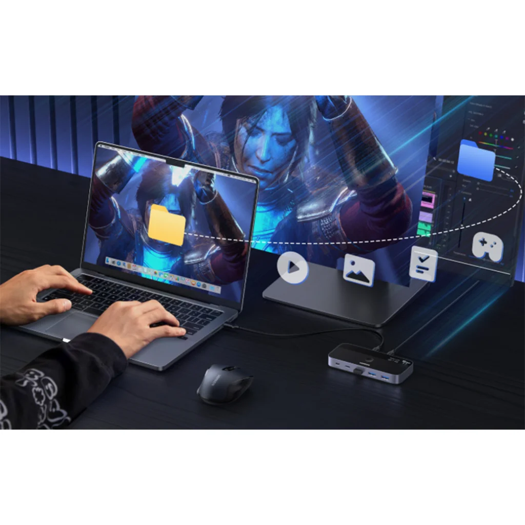 Az UGREEN CM691 kapcsoló lehetővé teszi, hogy akár négy USB-eszközt megosszon két számítógép között. Egyetlen kattintással válthat hozzáférést a laptopok vagy asztali számítógépek között. Ideális azok számára, akik két rendszeren vagy munkaállomáson dolgoznak - nincs szükség a kábelek átkötésére. A termék három USB-A 3.2 portot és egy USB-C 3.2 portot kínál.