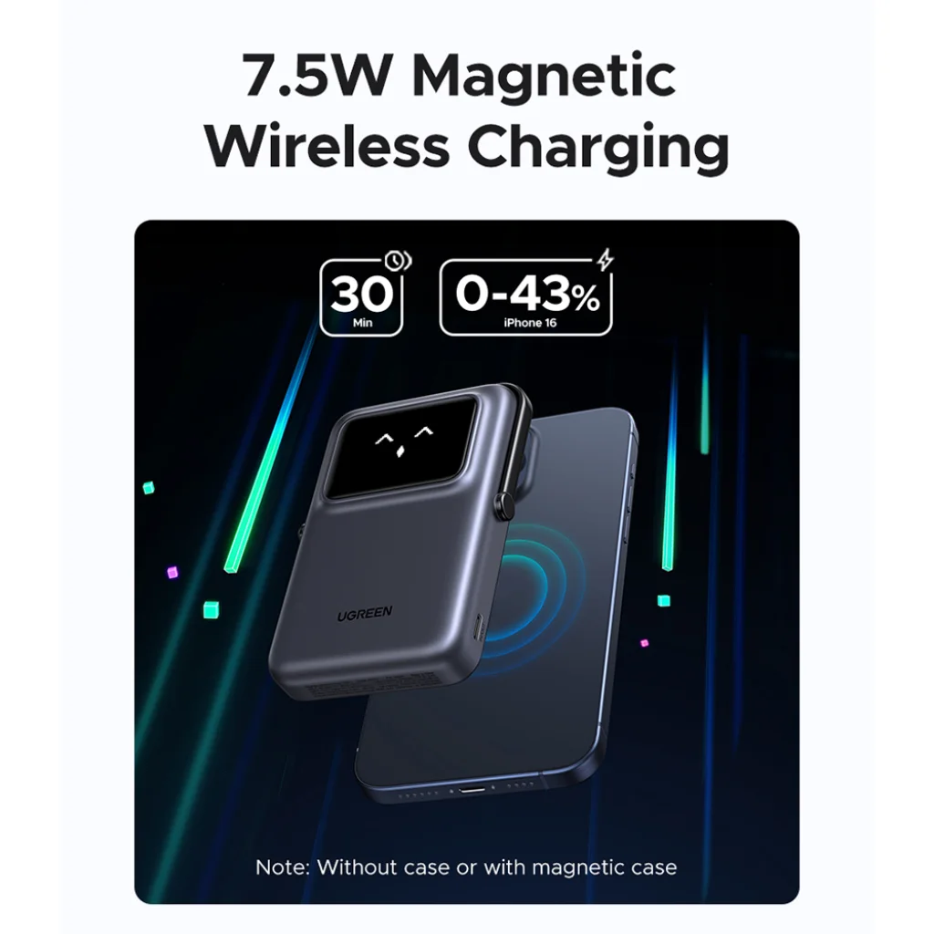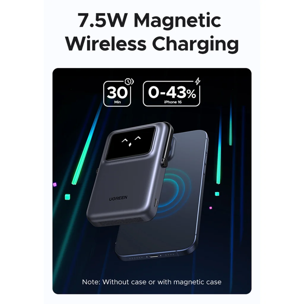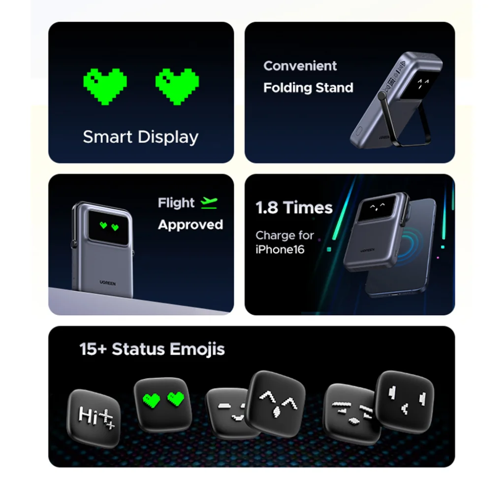 Fedezze fel az Ugreen Uno PB572 vezeték nélküli power bankot, amely a MagSafe technológia, a gyors töltés és a stílusos design tökéletes kombinációja. Ez a szürke színű, 10000 mAh kapacitású power bank nem csak energiát biztosít eszközeinek, de egyedülálló TFT kijelzőjével és beépített állványával is kiemelkedik a piacon.