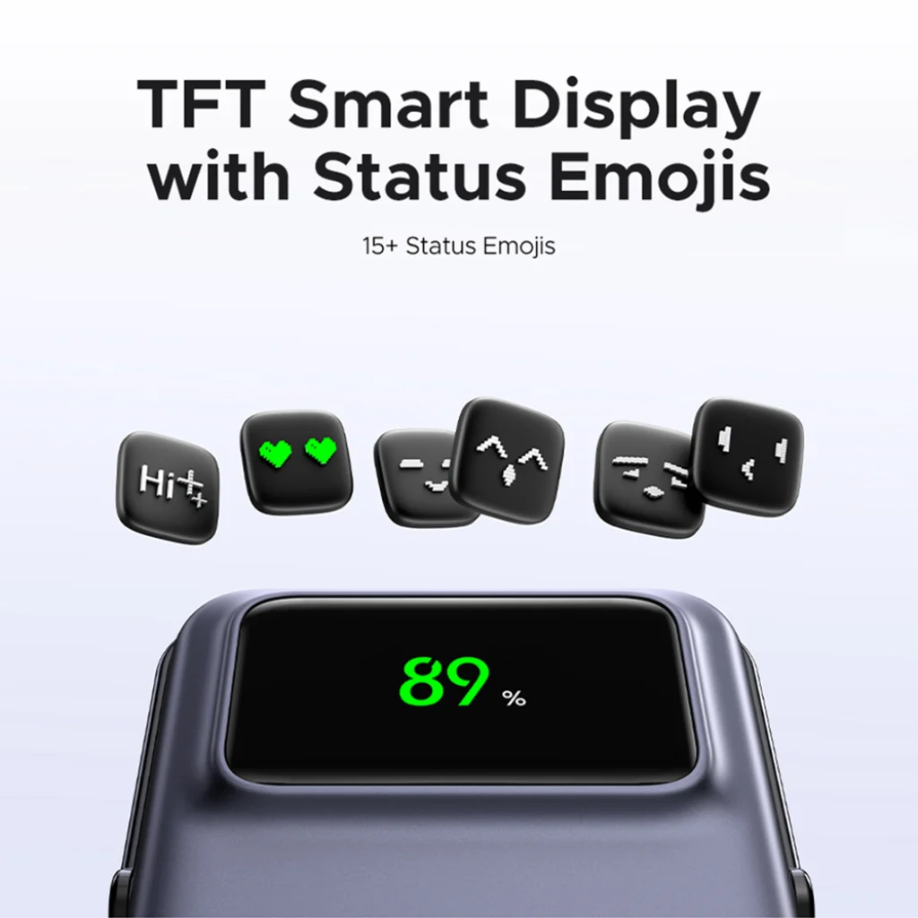 - TFT okos kijelző: Egyedülálló "robot arc" designnal és több mint 15 különböző emoji-val kommunikálja a töltöttségi állapotot, töltési módot és az esetleges hibákat, így a töltés élménye interaktívvá válik. A pontos akkumulátor százalék is leolvasható.
