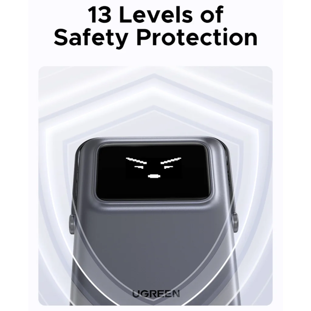 - 13 szintű biztonsági védelem: Az Ugreen Uno PB572 13 különböző biztonsági mechanizmussal rendelkezik, mint például túltöltés, túlmelegedés, rövidzárlat és túlfeszültség elleni védelem, garantálva eszközei és a power bank biztonságát.