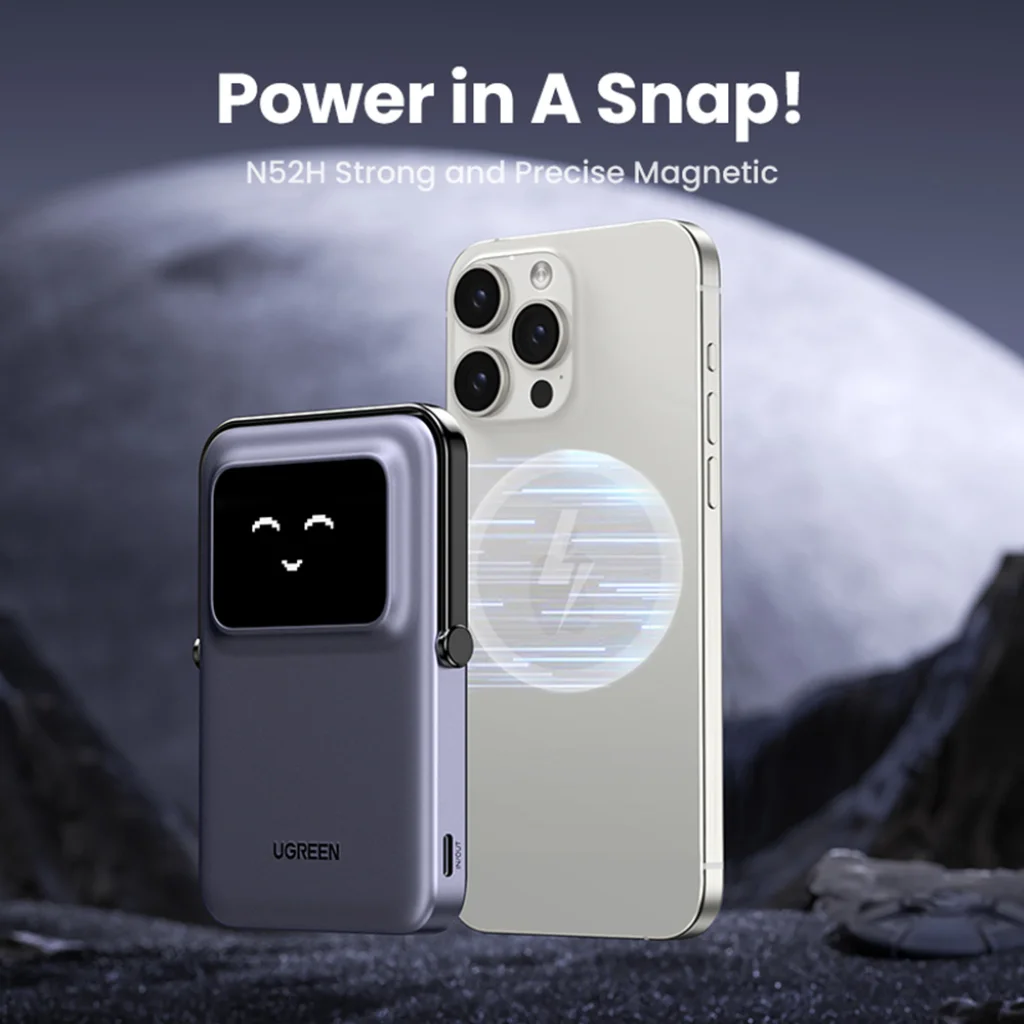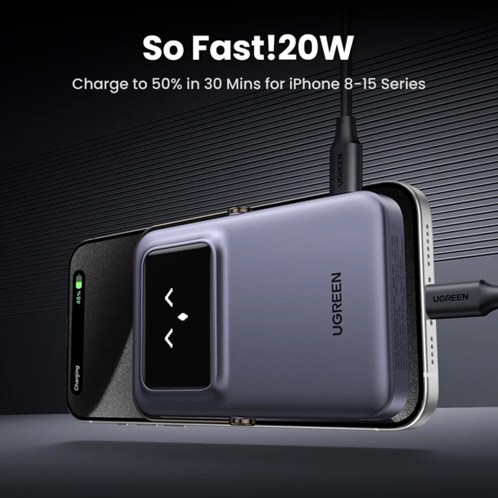Termék leírás Ugreen - PB571 (35605B) Power Bank - Digitális kijelzővel, Gyors töltés, Mágneses, Vezeték nélküli, 5000mAh, USB-C, 18W, 5V/3A - Szürke