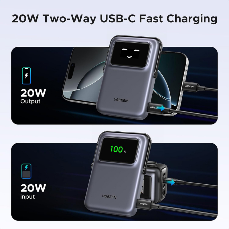 • TFT okos kijelző hangulatjelekkel: Az UGREEN PB764 Uno egyedi "robot" arckijelzője több mint 15 különböző hangulatjellel és a pontos töltöttségi százalékkal (pl. 89%) jelzi a powerbank aktuális állapotát, vizuálisan és játékosan kommunikálva veled.
