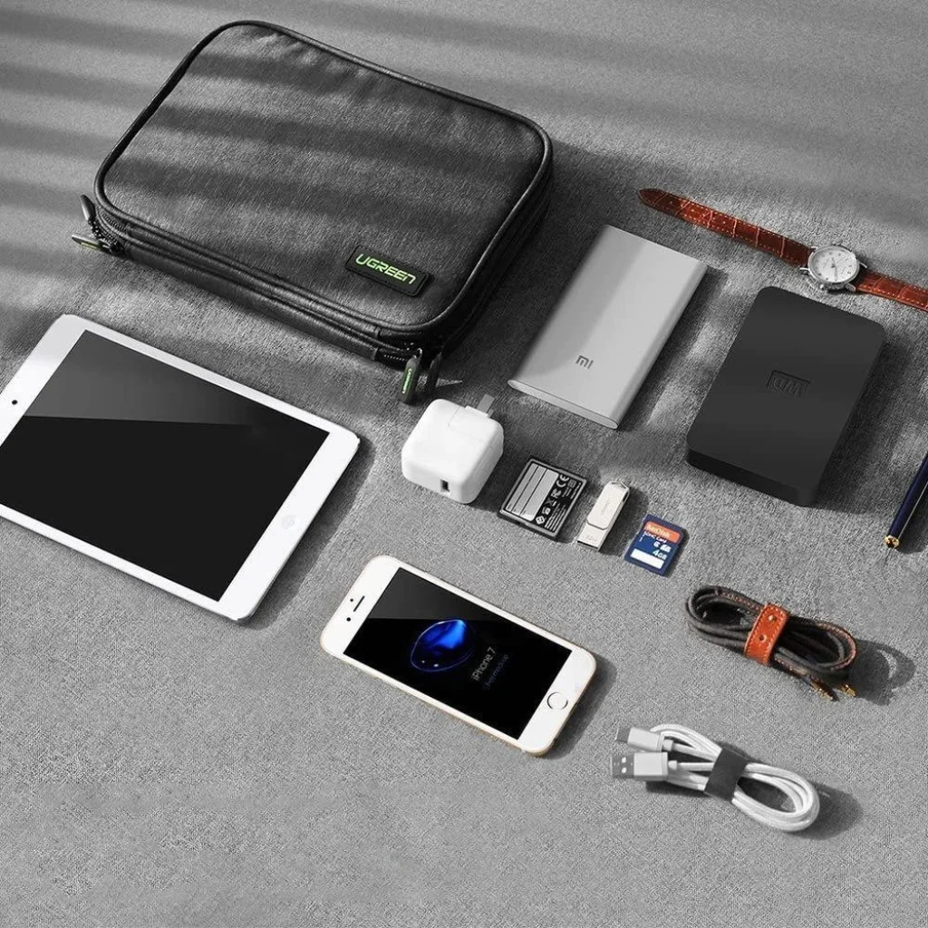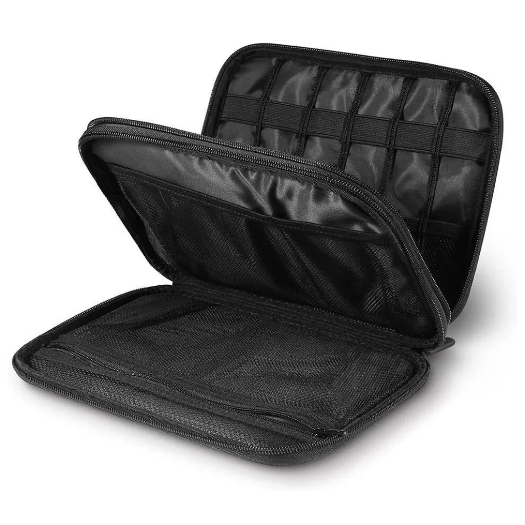 Ugreen tok merevlemez doboz HDD SSD telefon kábelek kiegészítők 24,5 x 17,5 x 5 Kábelek és elektronikai eszközök rendszerezése nagyon időigényes és fárasztó lehet. Különösen utazás közben. Hacsak nem szerzi be az Ugreen utazó tokot - egy praktikus tokot kiegészítők rendezett tárolására. Nemcsak, hogy minden kéznél lesz, de elfelejtheti a gabalyodott kábeleket vagy a rendetlenséget a csomagjában. Masszív kialakítás Miért alkalmas a termék elektronikai eszközök szállítására? Először is a masszív kétszintes szerkezet miatt:- Szint: 12 rugalmas hurok apró tárgyaknak, mint az USB kábel, fülhallgató, pendrive, SD kártya, utazási router,