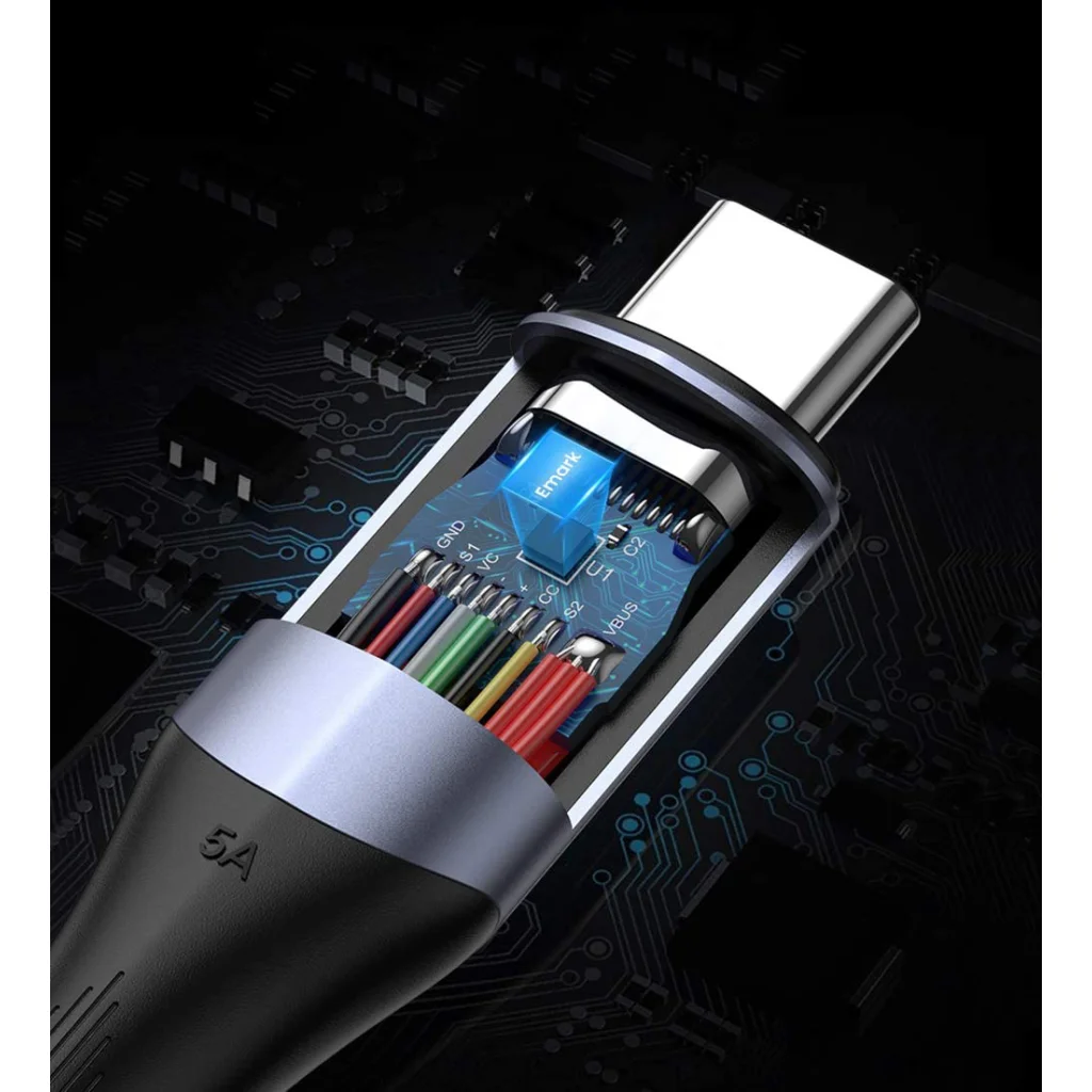 A kábel gyorsabb és stabilabb töltést és adatátvitelt biztosít. Támogatja a gyorstöltést 100 W-tal, 20 V-tal és 5 A-rel.