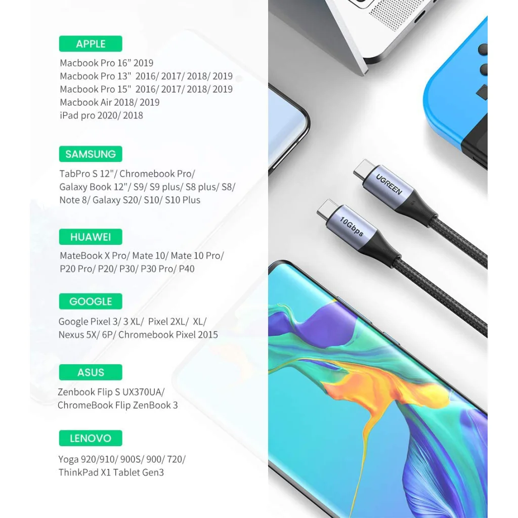 A kábel kompatibilis minden olyan eszközzel, amely rendelkezik C típusú USB bemenettel. Olyan eszközöket támogat, mint az Apple Macbook Pro, a Dell XPS, a Huawei Matebook és még sok más.