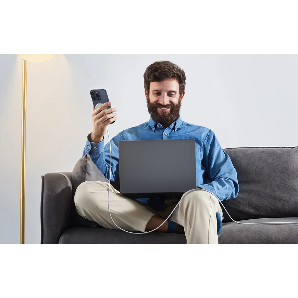 A mellékelt 1,5 méteres USB-C kábellel a Ugreen W703 töltő teljes szabadságot biztosít a töltés során. Akár a kanapén, akár az ágyban vagy az íróasztalnál ül, mindig lesz elég hosszú kábele ahhoz, hogy akadálytalanul használhassa a telefonját. A fonott kábel nemcsak stílusosan néz ki, hanem rendkívül tartós is.