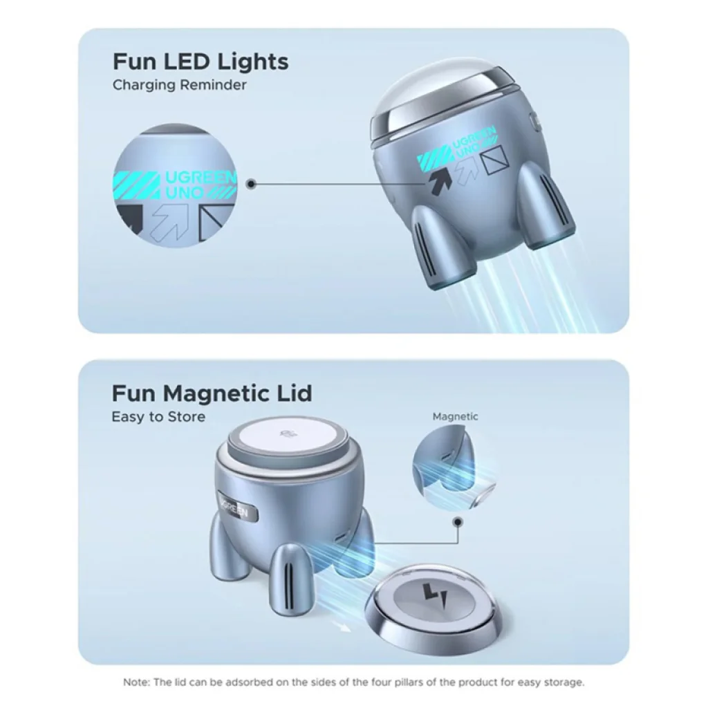 Az UGREEN W713 Uno szériás 2 az 1-ben vezeték nélküli töltőállomás messze túlmutat a hagyományos töltőkön. A különleges, játékos űrhajót formázó kék dizájn ötvözi a modern esztétikát a maximális stabilitással és a legújabb technológiai innovációkkal. Tökéletes választás azoknak, akik az íróasztalukon vagy az éjjeliszekrényükön is szeretik a stílusos, mégis prémium teljesítményt nyújtó kiegészítőket.