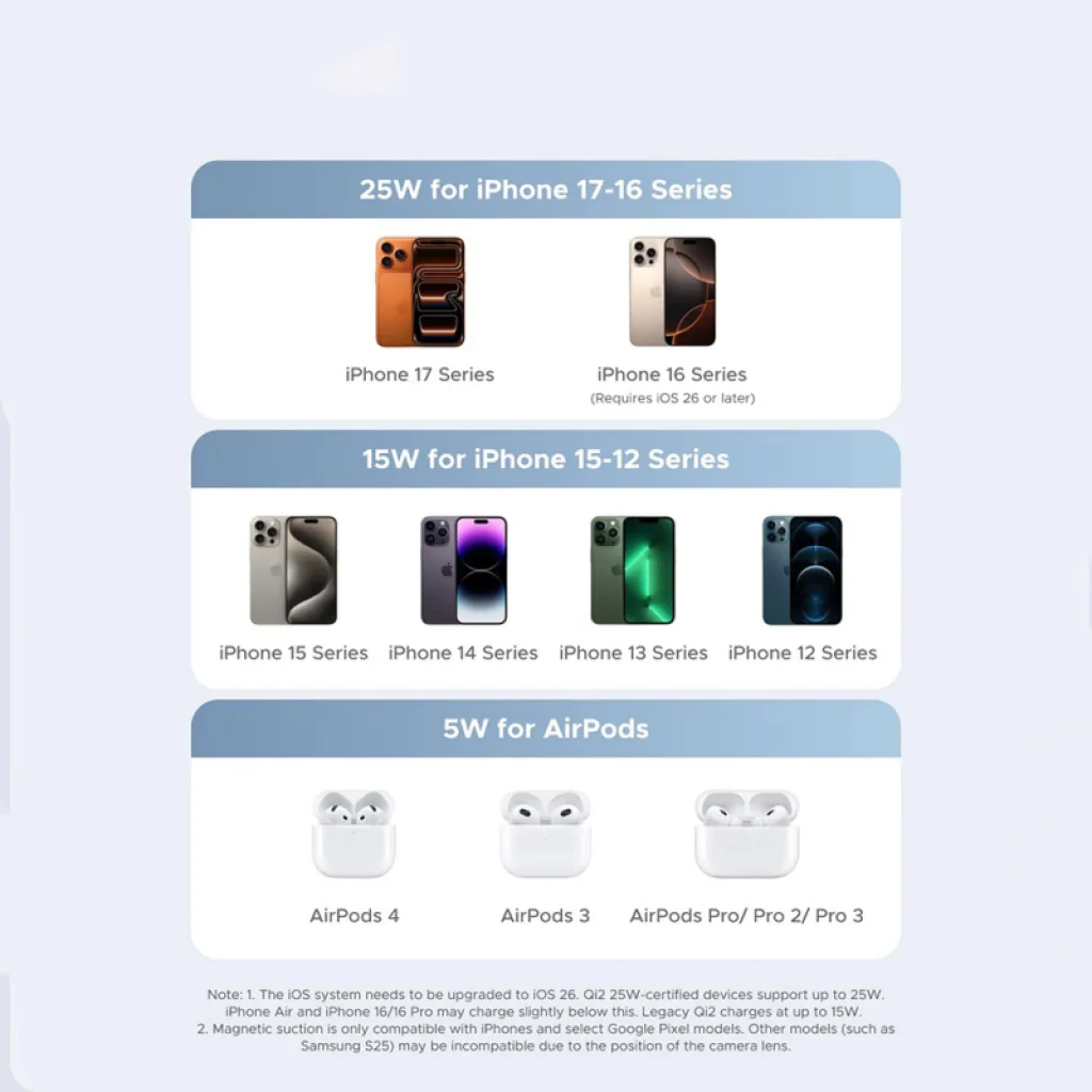 A hivatalos Qi2 tanúsítványnak és a precíz mágneses illeszkedésnek köszönhetően a töltés gyorsabb és biztonságosabb, mint valaha, akár 25W-os maximális összteljesítménnyel. A beépített okos rendszer automatikusan az eszközödhöz igazítja a leadott energiát: