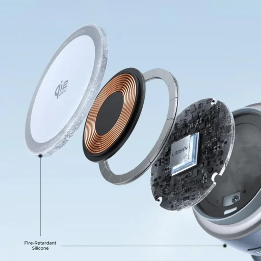 A töltőállomás prémium anyagok – polikarbonát és strapabíró cink ötvözet – felhasználásával készült. A töltőfelület speciális, tűzálló szilikon bevonattal van ellátva, amely amellett, hogy védi a készülékeidet a karcolásoktól, a túlmelegedés ellen is védelmet nyújt. A burkolat alatt rejlő prémium réztekercsek és a dedikált UGREEN intelligens chip garantálják a stabil, megszakítás nélküli és biztonságos energiaellátást minden helyzetben.
