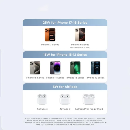 • Akár 25W gyorstöltés: A legújabb iPhone 16 és 17 szériás modellekhez (megfelelő szoftverfrissítés mellett).
