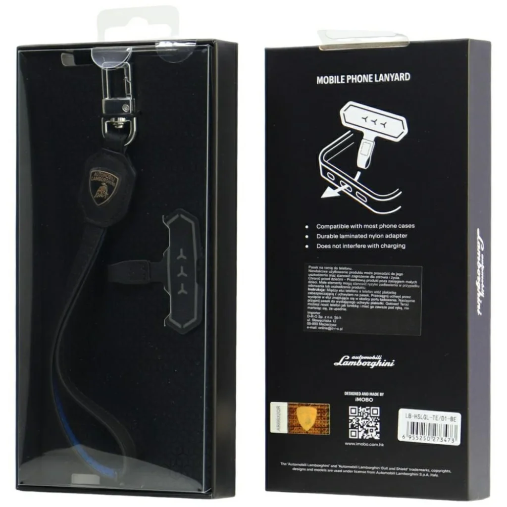A kézpánt tartós, laminált nejlonból készült adapterrel van felszerelve, amely lehetővé teszi a gyors telepítést a tok eltávolítása nélkül. Kompatibilis a piacon kapható legtöbb telefontokkal, és nem zavarja a töltési folyamatot. A Lamborghini logója hangsúlyozza a termék exkluzív jellegét, így ez a praktikus megoldás és a tekintélyes stílus tökéletes kombinációja.