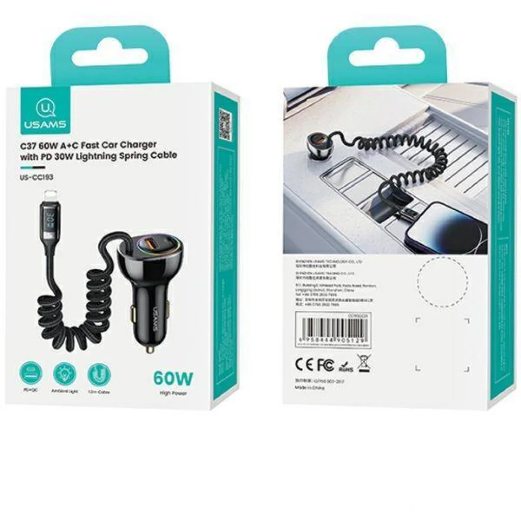 USAMS C37 Autós töltő 1xUSB+1xUSB-C 60W + Lightning kábel 30W PD+QC Gyors töltés fekete/fekete CC193CC01 (US-CC193)