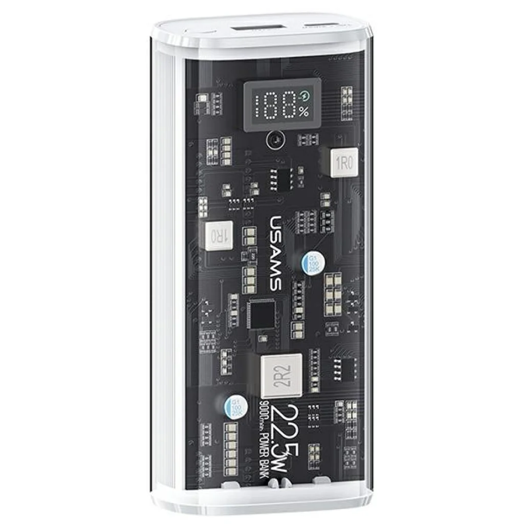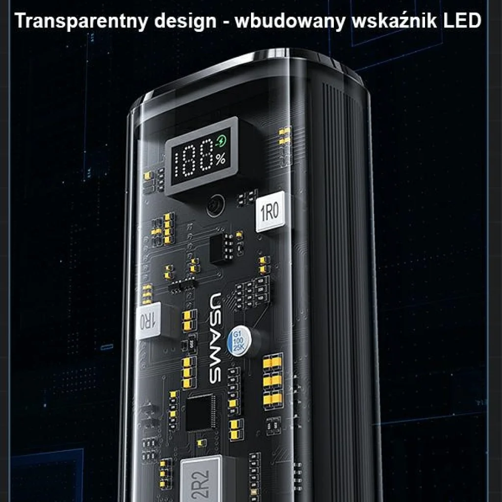- Az USAMS US-CD189 átlátszó burkolata mögött rejlő áramkörök a modern technológia lenyomatát képezik, vizuálisan is vonzóvá téve a power bankot.