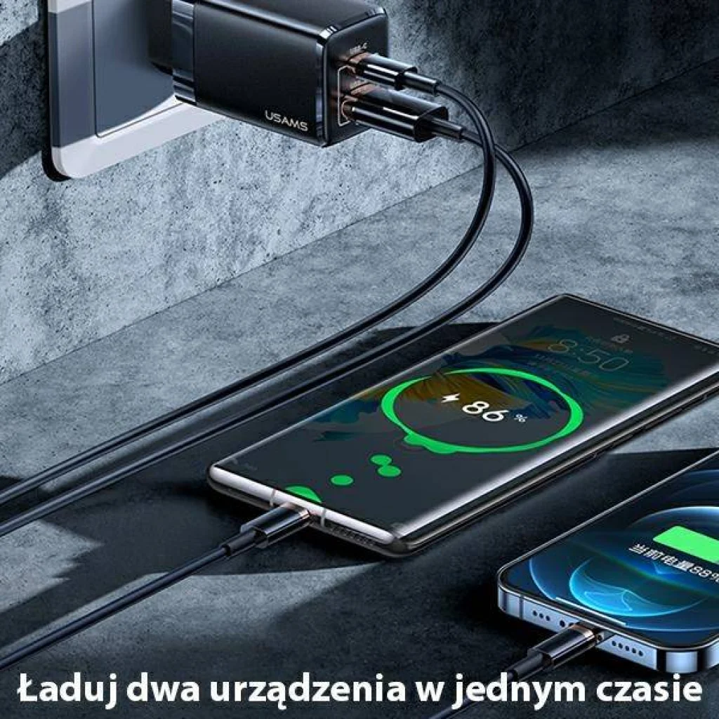 USAMS T41 US-CC137 GaN 47W Super Fast Charge - kompakt töltő hatalmas lehetőségekkel. Az innovatív GaN félvezető technológia (gallium-nitrid) használatával a töltő szilárd, könnyű, nem melegszik fel és nagyon gyorsan töltődik. A töltő két gyors USB-C (45 W) porttal és egy USB-A (27 W) gyorstöltő porttal rendelkezik. Támogatja az összes gyorstöltési szabványt, beleértve a Quick Charge 4.0 + / 3.0 / 2.0-t is. A töltő a telefon, laptop, táblagép és még a konzolok (Nintendo Switch) mellett is tölteni fog.