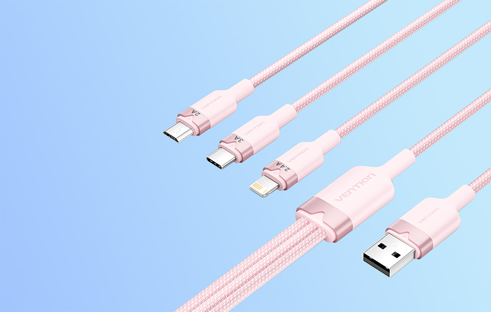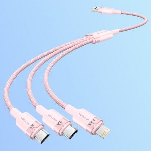 Az USB 2.0 A - 3 az 1-ben 3A Vention CTPPG 1,5M kábel (rózsaszín) egy sokoldalú megoldás, amely lehetővé teszi, hogy különböző eszközöket töltsön és szinkronizáljon egyetlen kábellel. Három különböző csatlakozóval - Lightning, USB-C és Micro-B - felszerelve tökéletes lesz a modern okostelefonok, valamint a régebbi eszközök, például powerbankek és fényképezőgépek töltésére.