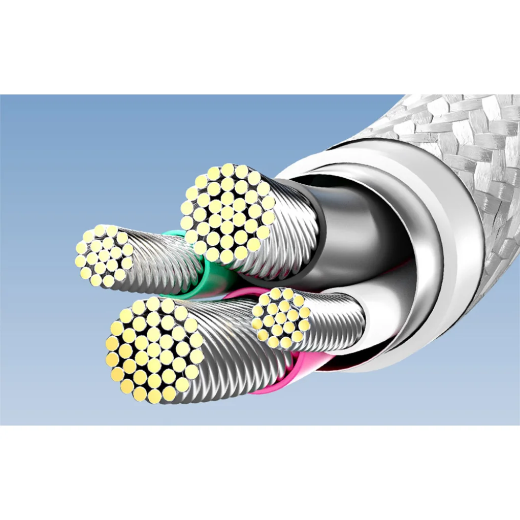 A Vention kábelt robusztus kialakítása különbözteti meg, amelyet több mint 30 000 hajlítási tesztnek vetettek alá. PVC köpenye alumínium borítással kombinálva hosszú élettartamot, kopásállóságot és stílusos megjelenést biztosít. A tartós konstrukció ellenállóvá teszi a kopással és a sérülésekkel szemben, így biztosítva a termék hosszú élettartamát.