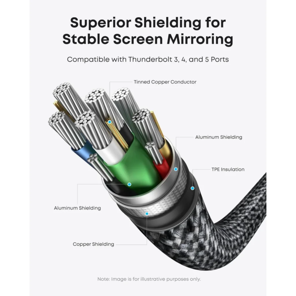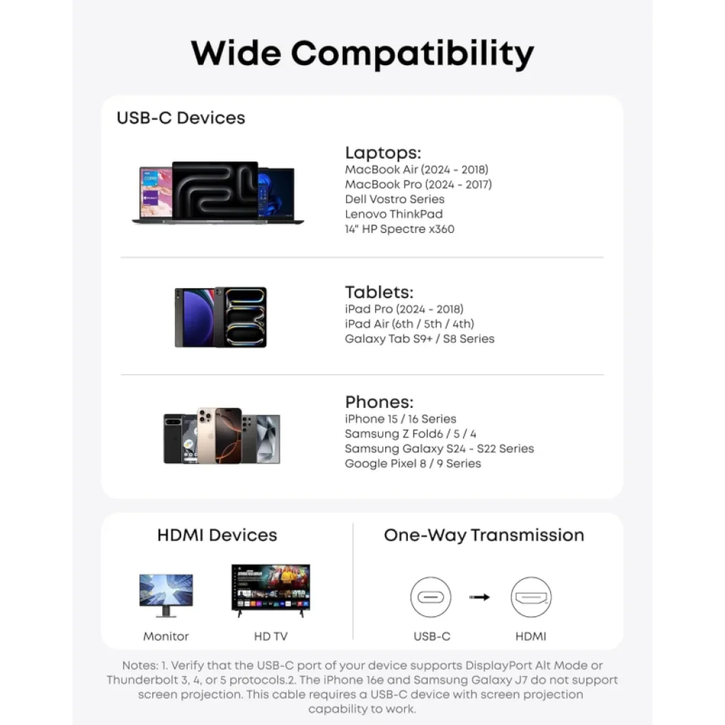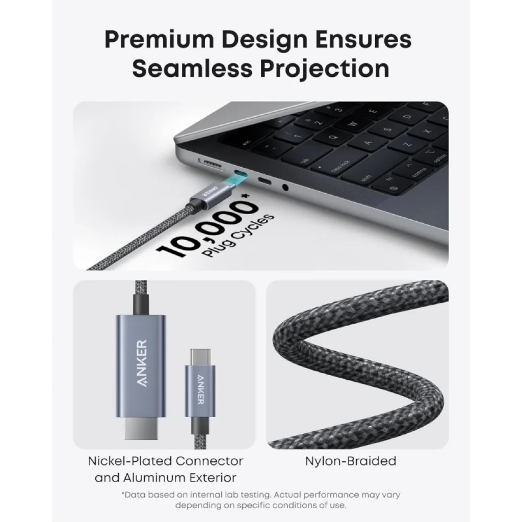 Az USB-C to HDMI Video Kábel Anker Nano - Szürke kábellel gyorsan csatlakozhatsz és élvezheted a lenyűgöző, ultra-nagy felbontású képeket. Ezzel a prémium kábellel tükrözheted vagy kiterjesztheted a készüléked képernyőjét további driverek vagy adapterek nélkül. Ideális irodai prezentációkhoz, játékmenetekhez, vagy kedvenc filmjeid otthoni megtekintéséhez, és biztosítja a sima 4K jelátvitelt 60Hz frissítési rátával. A fonott nejlon burkolat kiváló tartósságot biztosít, ellenáll a kopásnak és gubancolódásnak, míg az aranyozott csatlakozók megszakítás nélküli teljesítményt garantálnak. A kompakt és rugalmas kialakítás könnyű szállítást tesz lehetővé, elegáns és robusztus megoldást nyújtva bármely monitor vagy TV szórakoztató vagy termelékenységi központtá alakításához.