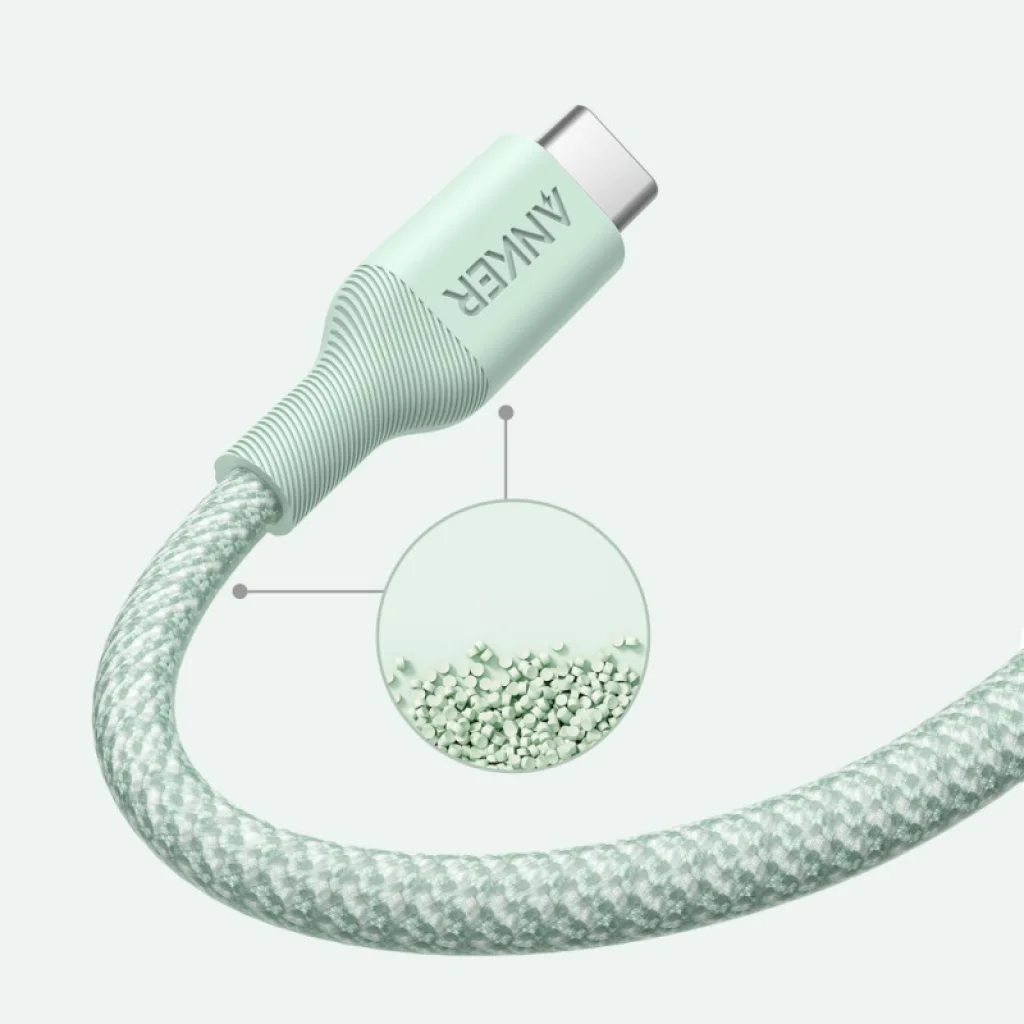 Az Anker 544 Bio kábel külső rétege innovatív módon növényi alapú bioanyagokból, például kukoricából és cukornádból készült. Ez a megközelítés jelentősen csökkenti a környezeti terhelést a hagyományos műanyag alapú kábelekhez képest. Választásával nem csak eszközeit látja el energiával, hanem bolygónkat is óvja. A kábel kialakítása a természetes, organikus érzést sugározza, miközben modern, minimalista dizájnt képvisel.