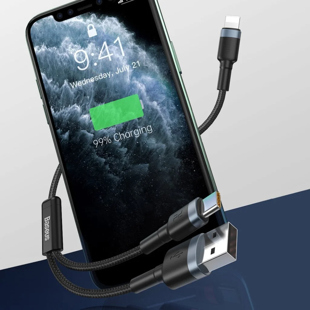 Prémium minőségű 2in1 kialakítású USB/USB-C/Lightning kábel. Réz anyaghasználatának köszönhetően, a lehető leggyorsabb töltést biztosítja számunkra. Akár két eszköz egyidejű töltésére is alkalmas. Nylon harisnyázott külső része rendkívül ellenállóvá teszi.