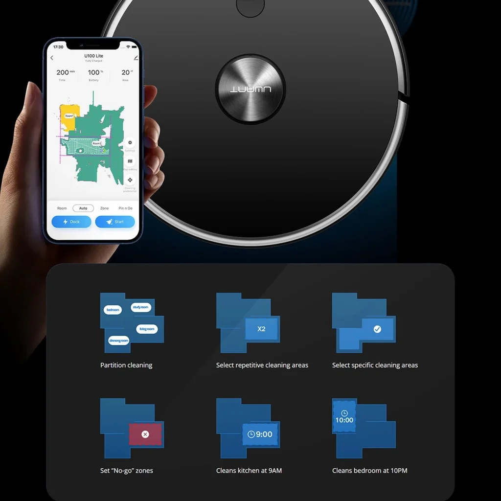 - Automatikus töltés: Az U100 Lite automatikusan visszatér a töltőállomásra, amikor az akkumulátor lemerülőben van. Ez biztosítja, hogy a robot bármikor készen álljon a munkára, felügyelet nélkül.