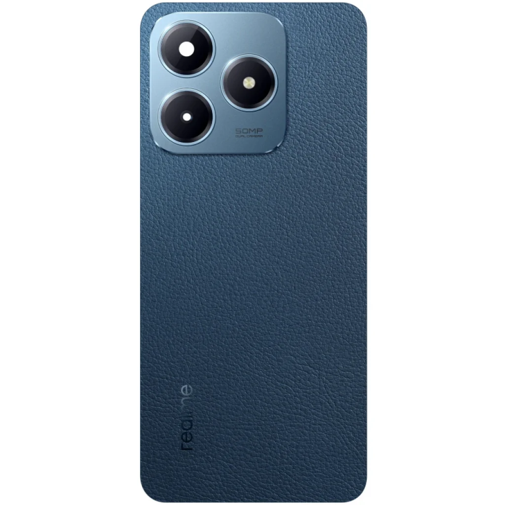 Valódi bőr kék akkumulátor hátlap Realme C63-hoz - Egy pótalkatrész a Realme licenc alatt, amely a telefon sérült hátlapjának cseréjére szolgál. A csomag tartalmaz ragasztót és kamera lencsét.