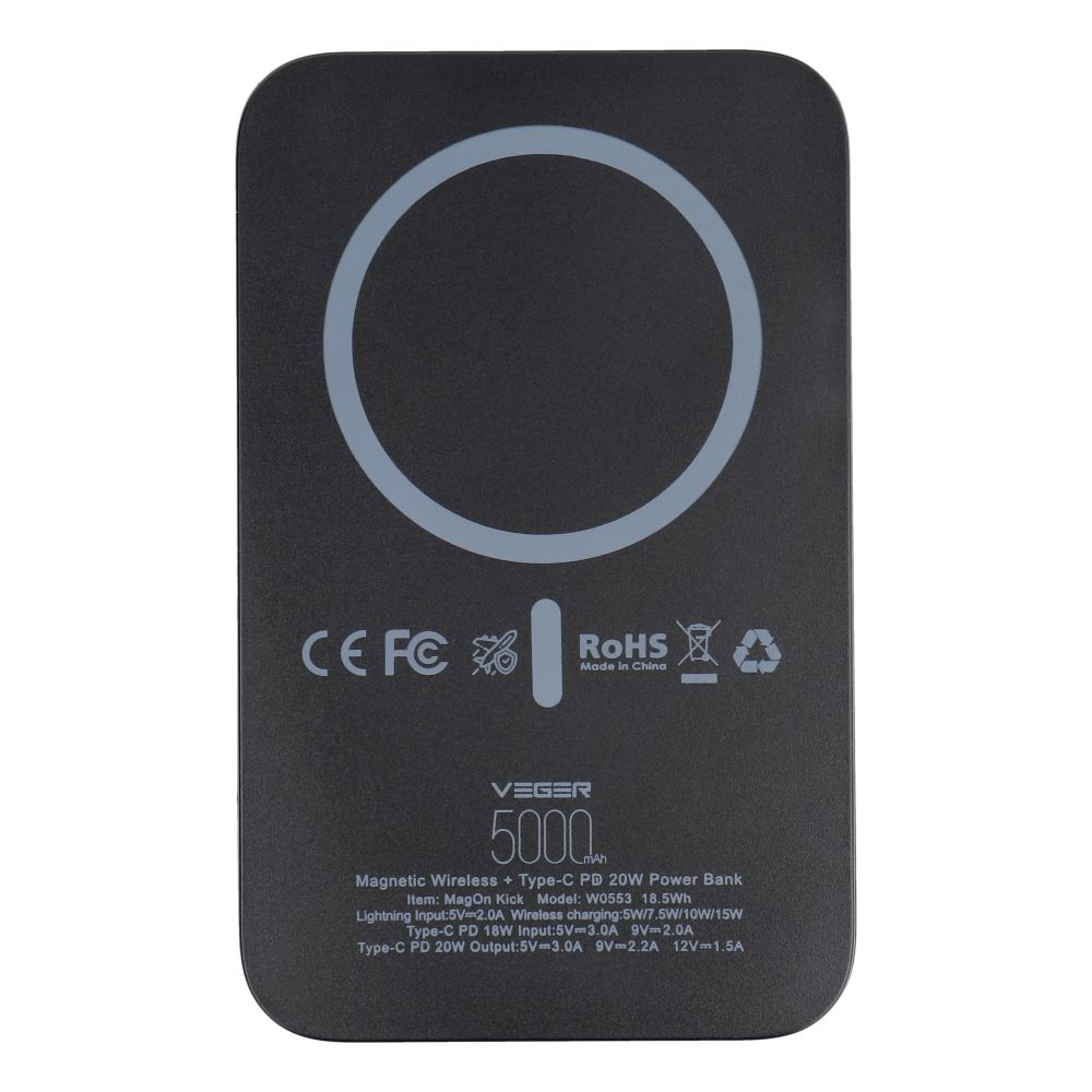 A Veger MagOn Kick power bank 5 000 mAh kapacitással a gyors töltés garanciája bármikor és bárhol. Kényelmes töltésEgy piacon elismert lítium-polimer akkumulátor garantálja a power bank lassabb lemerülését. Az 5 000 mAh kapacitás lehetővé teszi, hogy egyszer feltöltse az energiát a telefonban, így útközben, amikor nincs állandó hozzáférés konnektorhoz, hasznos lesz. Induktív és hagyományos töltés Az USB-C és Lightning portok támogatják a Power Delivery (20W) és Quick Charge 3.0 technológiákat, amelyek lehetővé teszik, hogy nagyon rövid idő alatt feltöltse okostelefonját (0-ról 50%-ra akár 30 perc alatt). Ha nincs Önnél kábel, használja a vezeték nélküli töltés funkciót a MagSafe technológiának köszönhetően. Működik különböző típusú tokokkal is. Vigye magával, bárhová szüksége van A minimalista, karcsú dizájn és kis súly könnyűvé teszi az utazás során való használatot, és az 5 LED dióda tájékoztat a power bank töltöttségi szintjéről. Specifikáció: Akkumulátor kapacitása: 5 000 mAhAkkumulátor feszültsége: 3.7VMaximális feszültség: 5V/2ATeljesítmény: 20WAnyag: MűanyagPortok: USB-C, LightningSúly: 120 gSzín: feketeTámogatja a Power Delivery (20W) és Quick Charge 3.0 technológiákat
