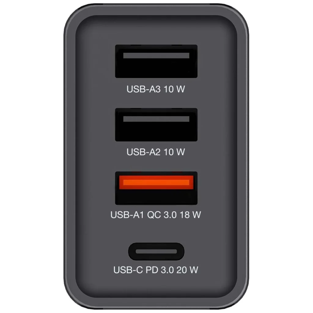 - 1 USB-C port (PD 3.0 20W-ig) és három USB-A port (1 x USB-A QC 3.0 18W-ig, 2 x USB-A 10W-ig), összteljesítmény akár 30W