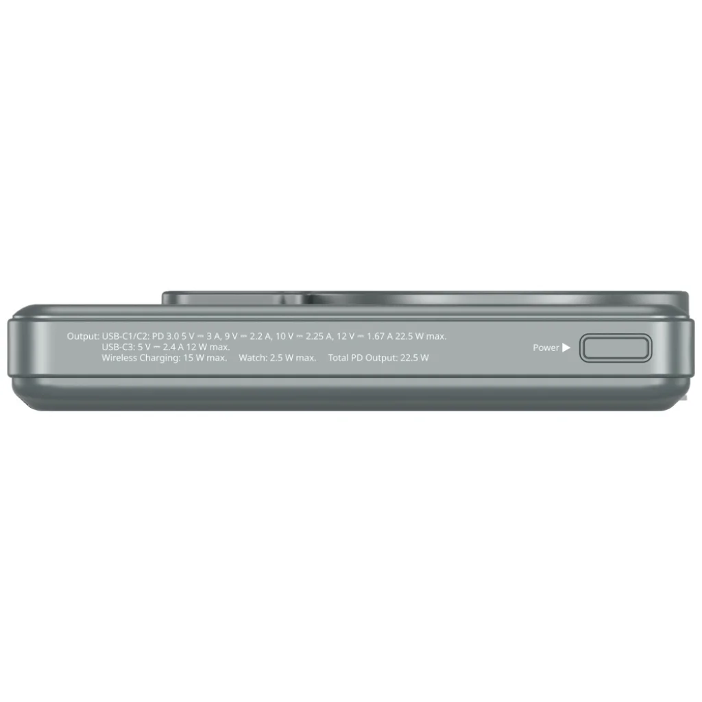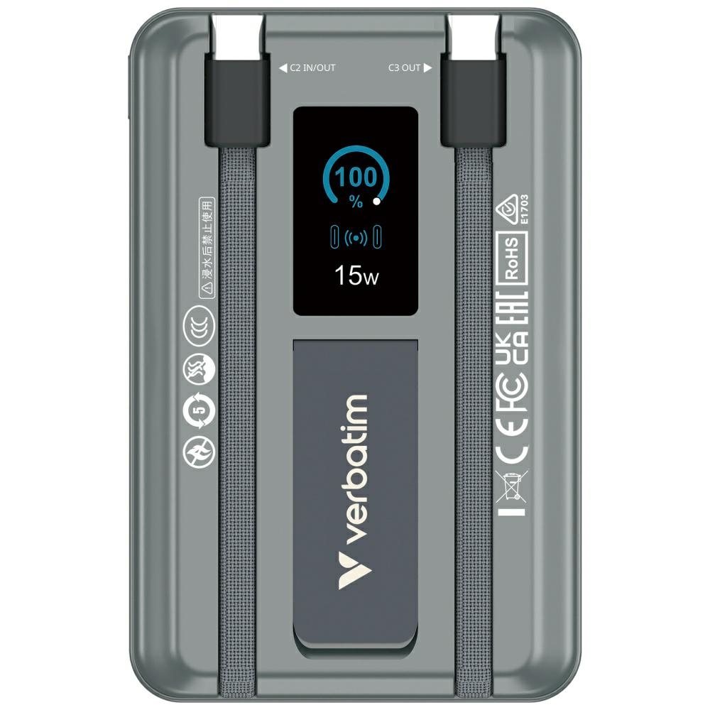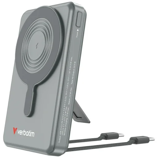 A Verbatim Charge 'n' Go egy praktikus energiaforrás, amely 10000 mAh kapacitással rendelkezik, és mindennapi okostelefonok és mobil eszközök töltésére tervezték. A modell egy TFT kijelzőt használ, amely mutatja az energia szintet és az aktuális működési státuszt. A készülék kombinálja a vezetékes és vezeték nélküli töltést, növelve a felhasználói kényelmet és rugalmasságot. Kompakt mérete miatt könnyen elfér egy táskában vagy hátizsákban, és a több eszköz egyidejű töltése növeli a funkcionalitását. A Charge 'n' Go alkalmas mind utazásra, mind munkára vagy napi tevékenységekre. A biztonsági mechanizmusok közé tartozik a rövidzárlat, a túltöltés, a túláram, a túlmelegedés és az alacsony feszültség elleni védelem. A FOD funkció felelős az idegen tárgyak észleléséért a vezeték nélküli töltési területen, növelve a felhasználói biztonságot. Az eszköz beépített tartóval rendelkezik, amely lehetővé teszi a telefon kényelmes függőleges vagy vízszintes elhelyezését töltés közben. A kijelző mutatja az akkumulátor szintet és az aktuális töltési státuszt, megkönnyítve a működés ellenőrzését. A konstrukció úgy van tervezve, hogy stabil teljesítményt biztosítson 0 és 35 Celsius fok közötti hőmérsékleten. A csomag tartalma: powerbank, mágneses gyűrű, USB-C kábel, kézikönyv.