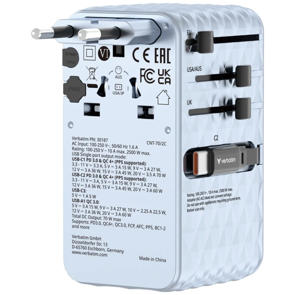 Töltsön akár hat eszközt egyidejűleg a Verbatim GaN III univerzális utazási adapterrel. A készülék egy AC aljzatot, USA/JP aljzatot, USB-C portot, USB-A portot és két visszahúzható USB-C kábelt kínál, összesen akár 70 W teljes teljesítménnyel. Az USB-C PD 3.0 és QC 4+ szabványok lehetővé teszik a töltést akár 70 W teljesítménnyel, míg az USB-A QC 4+ 60 W-ig támogatja a töltést. GaN TECHNOLÓGIA biztosítja a hatékony töltést és csökkenti a hőtermelést.