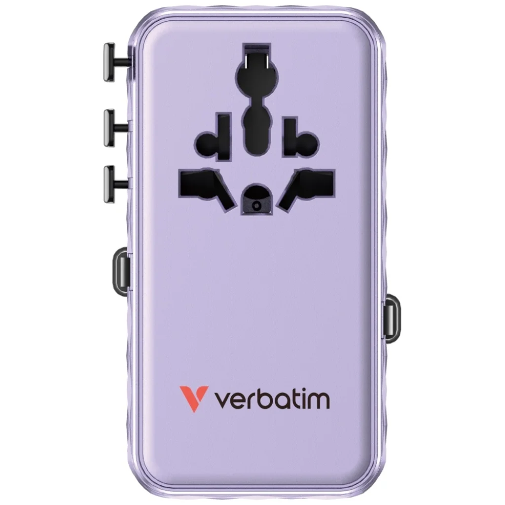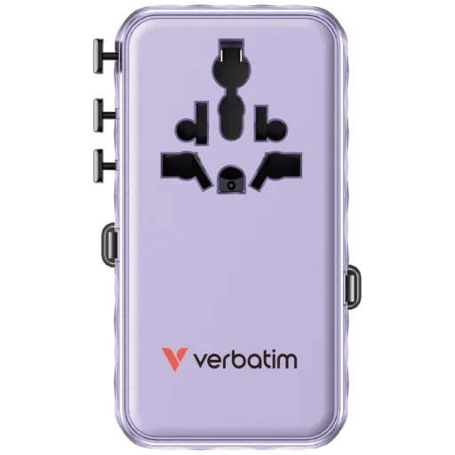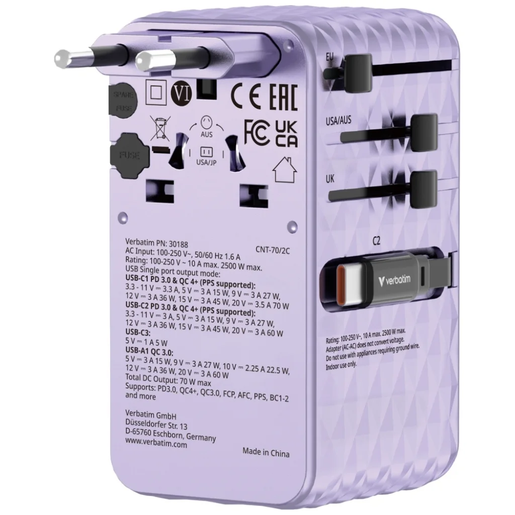 A Verbatim Travel Adapter egy kompakt és funkcionális univerzális adapter, amely több mint 180 országban támogatja az eszközök töltését. Ideális laptopok, okostelefonok, Bluetooth hangszórók, táblagépek, power bankok és sok más eszköz töltésére. Tartalmaz két beépített visszahúzható USB-C kábelt, valamint egy AC aljzatot, USA/JP aljzatot, USB-C portot, USB-A portot és két további visszahúzható USB-C kábelt, összesen akár 70 W kimeneti teljesítménnyel. A GaN technológia biztosítja az energiahatékony töltést és a hőtermelés csökkentését. Az adapter elegáns, fekete 3D gyémánt mintázatú házzal rendelkezik, és magas minőségű égésgátló polikarbonátból készült. Tanúsított CE, UKCA, FCC és ROHS szabványok szerint, valamint 10A biztosítékkal van ellátva a BS1362 szabvány szerint, és praktikus utazótokkal kapható. Maximális teljesítménye 70 W, különféle csatlakozókhoz és aljzatokhoz is alkalmas. A termék támogatja többek között a PD 3.0, QC 4+ és QC 3.0 szabványokat. A színe lila.