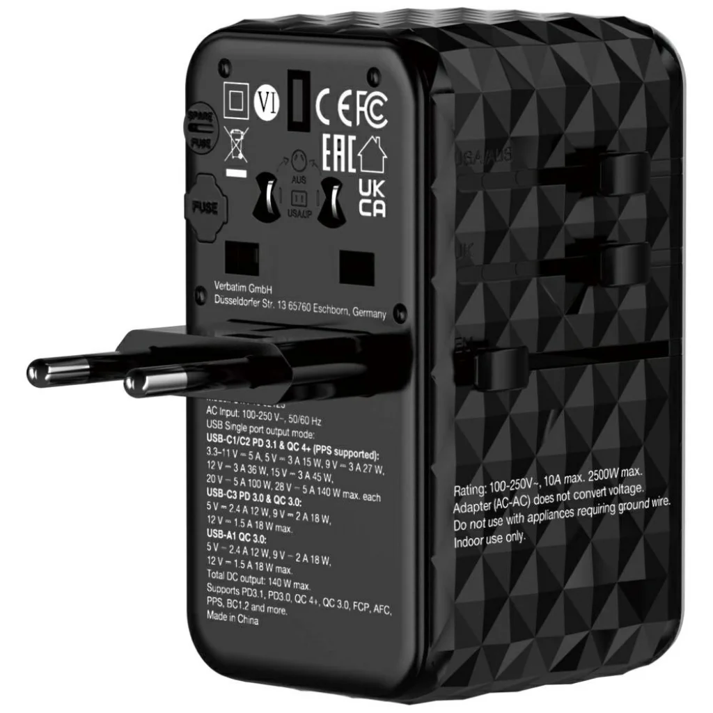 Verbatim UTA-10 GaN USB-A/3xUSB-C PD 140W Utazó Adapter fekete
